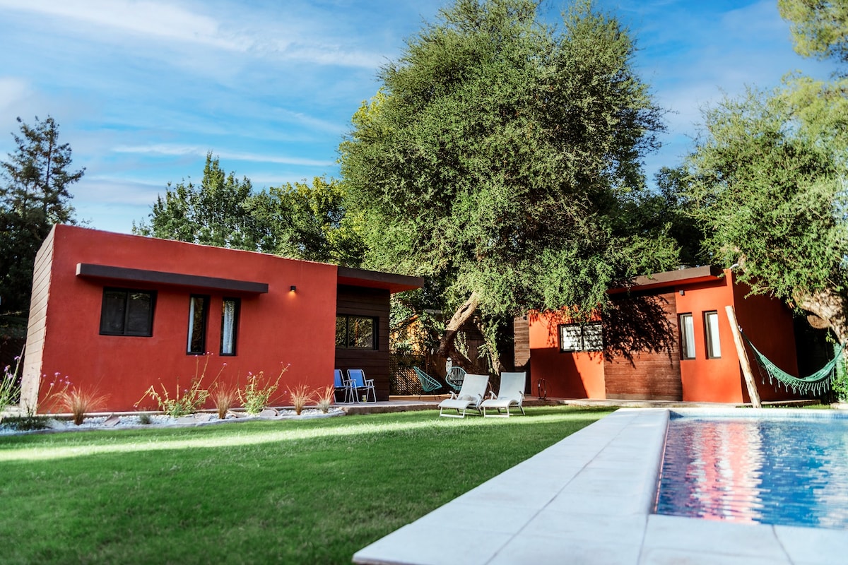 A unique place. A space to fully experience. 13 km from the city of Mendoza and within the "Wine Roads" circuit. With a private exit, exclusive covered garage, excellent Wi-Fi, a queen-size bed, en suite bathroom, TV, refrigerator, electric oven, microwave, electric kettle, bed and bath linens, and pool towels. We also include a split-screen TV and a safe. We continue to add comfort and tranquility to make your stay in our space unforgettable.
