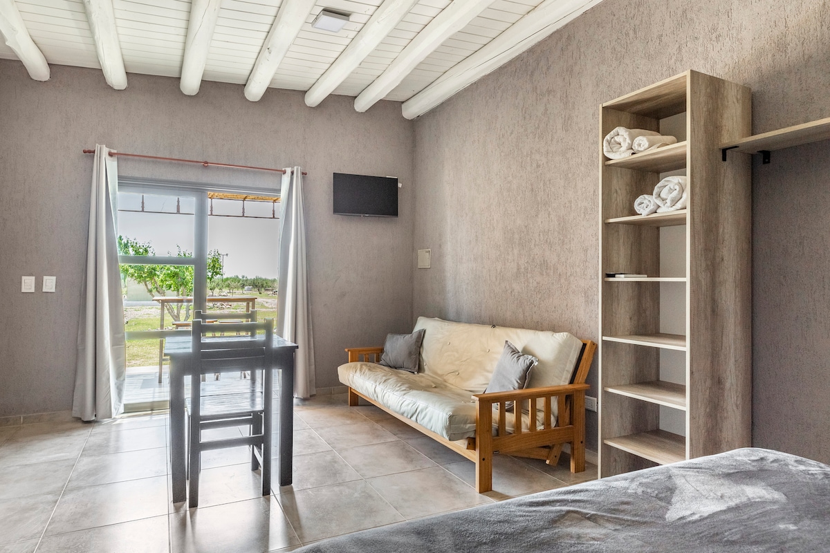 Cabaña tipo estudio en la Ruta del Vino de Mendoza, rodeada de olivos y naturaleza. Baño privado, kitchenette, parrilla propia, mesa exterior y piscina compartida. A solo 20 minutos de la Ciudad de Mendoza y cerca de Casa Vigil y Villafañe.