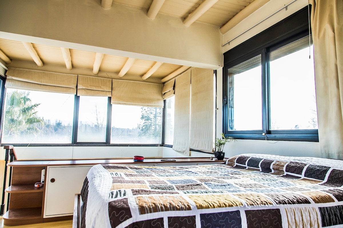 Artista plástica ofrece: loft continuo a su casa con entrada independiente. Rodeado de árboles y un hermoso jardín con pileta. EL LUGAR INCLUYE DESAYUNO: cafe, te, leche, pan, manteca, queso crema, dulce, huevos y frutas de estación. Art teacher offers: Spacious, independent studio apartment, surrounded by trees in middle of a beautiful garden. Includes living room, bedroom and kitchen areas, and separate bathroom. Very luminous, large windows with views of gardens and swimming pool.