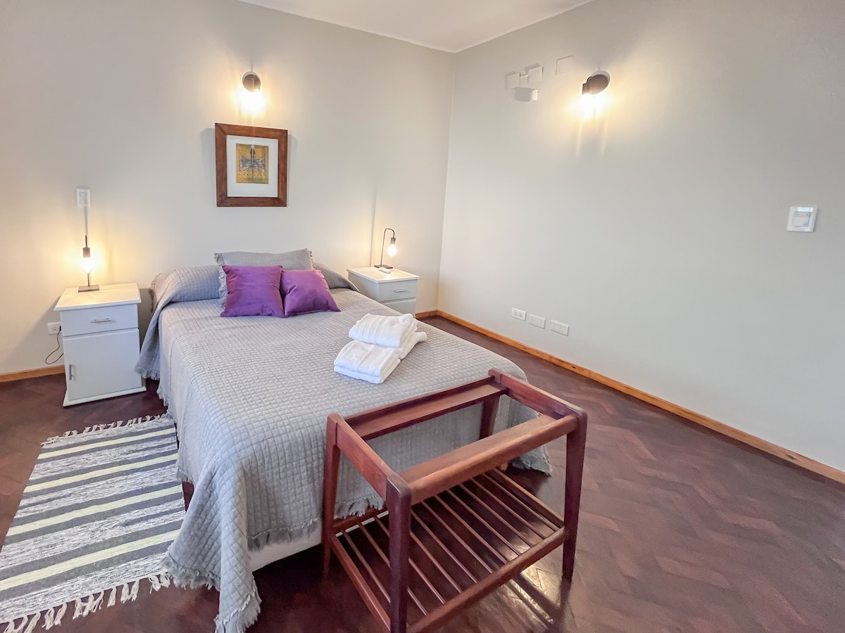 Relax in this divine brand new space, renovated with style, quality and design. Optimal location in a quiet centric residential neighborhood surrounded by markets and vegetation. We highlight its proximity to our large San Martin park, ideal for exercising and to known gastronomic Avenue. High-end Simmons brand new king box spring, to rest comfortably. On a second floor with a balcony. All rooms have windows Bikes available Self check in with unique code 2 Air conditioned with hot-cold split air