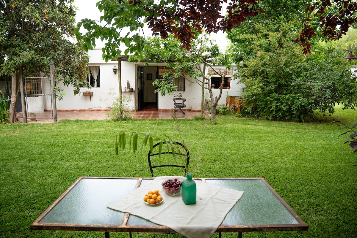 Una casa de barro , hecha por una artista del mosaiquismo, llena de detalles,en medio de una finca agroecológica donde se cultivan todo tipo de frutas ,para deleitar los sentidos,una hermosa huerta y jardin de aromaticas y medicinales, ah, tambien tenemos un jardin de catus exoticos y un viñedo de uva malbec. El acceso a la finca es muy simple, esta a 13 km de la cuidad, (15 min) entre los distritos de Cuadro Benegas y Rama Caida, zona muy tranquila y con magnificos restaurants .