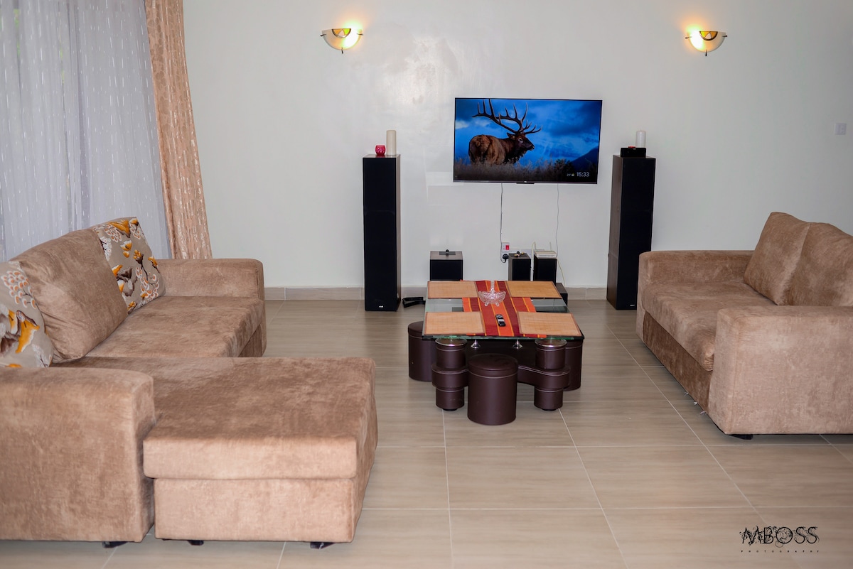 Have fun with the whole family at this stylish modern villa lcated in a safe location near Nakuru City Center. There is a power backup system. The villa has Four en-suite bedrooms with balconies, there is an extra room upstairs that can be used for entertainment/relaxing/ movie room - it has a large screen. For families with children, there is a baby cot bed. There is a 75 inch smart tv and WI-FI. Also there is Netflix.