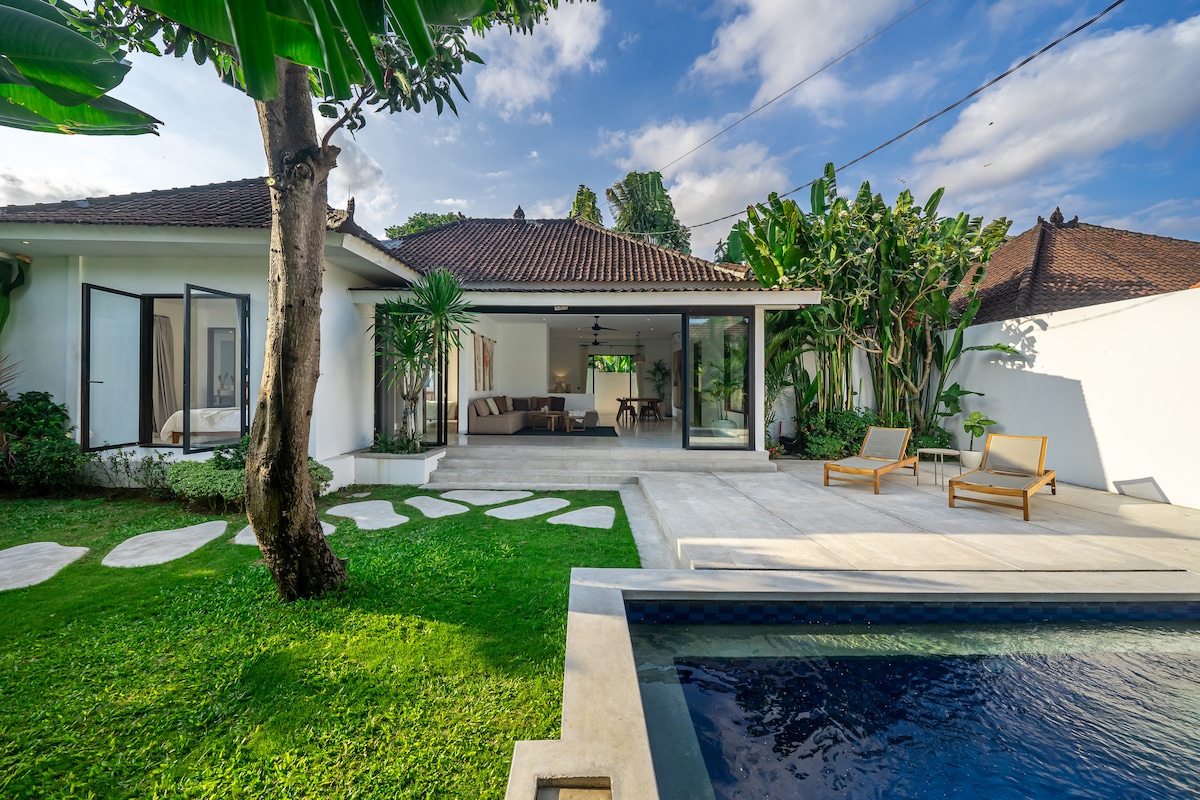 NEWLY AIR-CONDITIONED IN LIVING ROOM SPACE ❄️ Beautiful, Spacious and modern two-bedroom villa in the heart of Canggu. The property features an enclosed living room now with aircon ❄️ A fully equipped kitchen, and a private swimming pool and gardens. Each bedroom includes an ensuite bathroom, air conditioning and quality bedding. Only a few minutes walk away from Canggu's Finest Restaurants, Bars, Beaches, Spas, Gyms and Designer Boutiques, and only 5 min drive away to Pererenan.
