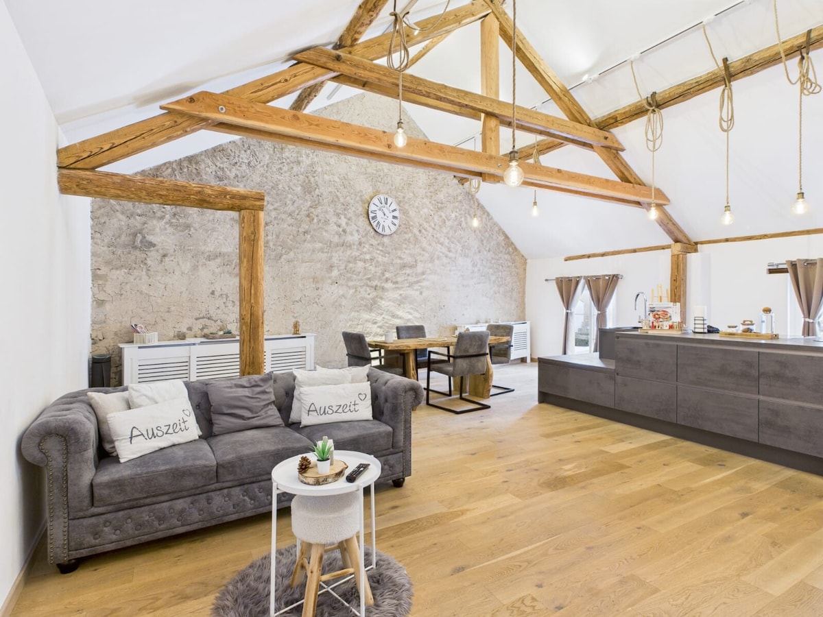 Meine Unterkunft ist in der Nähe von Natur und guter Luft und Ruhe. Du wirst das Loft lieben wegen dem Platz im Freien, den Garten, den Kamin innen für die Gemütlichkeit, 63qm zum Wohlfühlen in altem Gemäuer mit Lehmputz innen. Auf der Galerie ist ein 160cm breites Bett und ein Schreibtisch, unten eine Schlafcouch. Meine Unterkunft ist gut für Paare, Alleinreisende und Eifelfans. Alt trifft Neu ist das Motto: Alte Balken knacken auch mal, der Regen prasselt aufs Dach= Vor- und Nachteil?