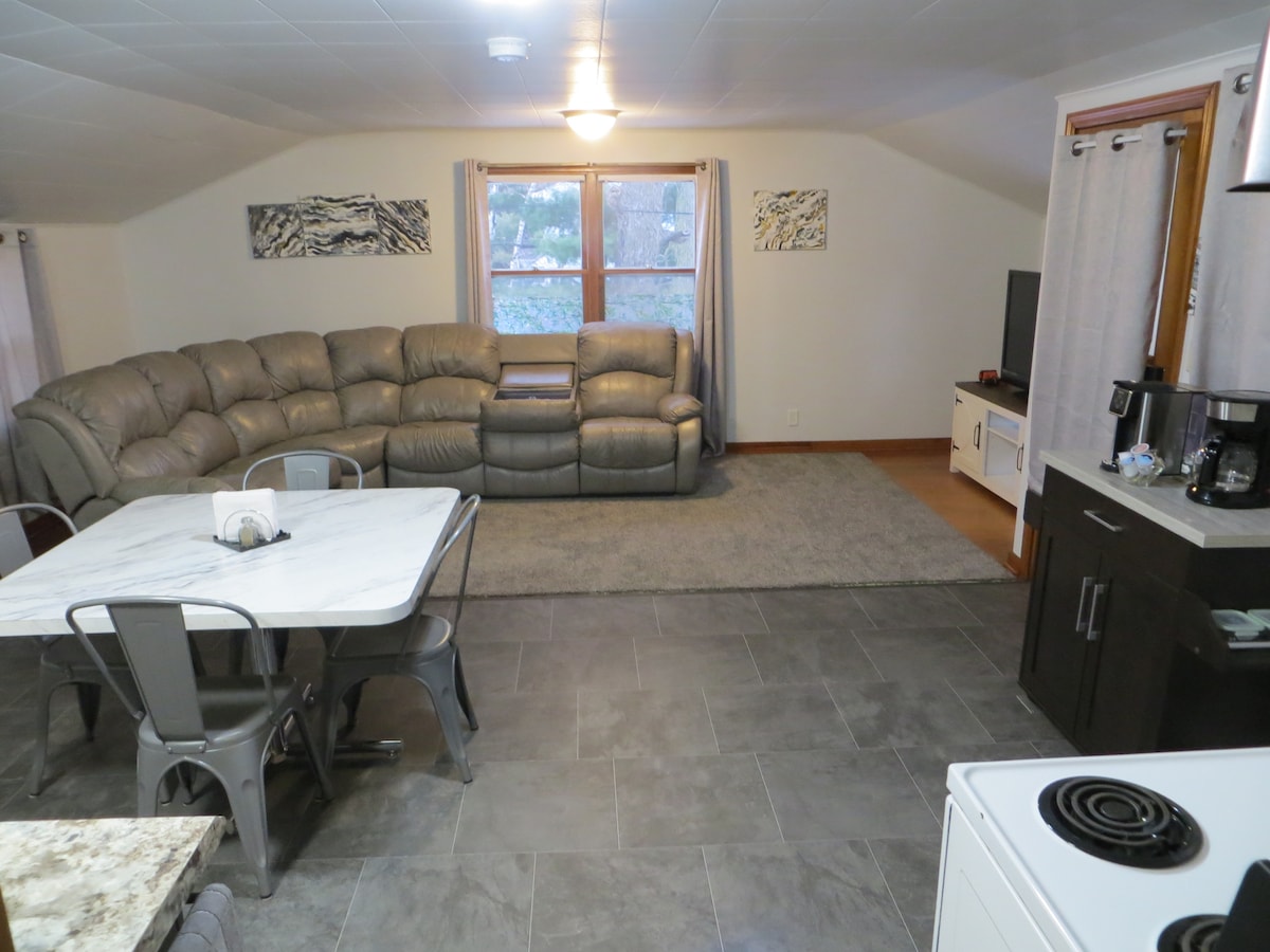 This special place is close to everything, making it easy to plan your visit. Cozy upstairs suite in a duplex centrally located near downtown Menominee.Just blocks from restaurants and bars including Dexters, Pit Bros. BBQ, Spirit House Distillery. It's only 6 blocks to enjoy beautiful sunrises on Memorial beach which is near the Marina and many more attractions in the downtown lakefront area on 1st st. Antenna tv & Amazon fire stick apps.King size bed & blackout curtains.55 miles to Green bay