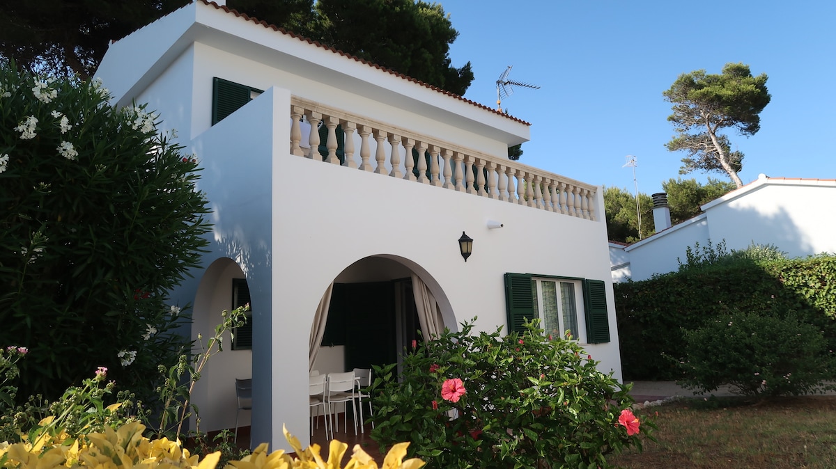 Our typical "casita menorquina" is situated 100m from Cala Blanca, a lovely crystal clear small beach with restaurants and bars. It's located in a very tranquil neighbourhood, inside a small condo with 3 other similar houses sharing a big swimming pool. The house has a big private outdoor area with garden and BBQ facilities and... the best... a rooftop terrace with chill out area and a gorgeous sea/sunset view. The house has 2 rooms with air conditioning.