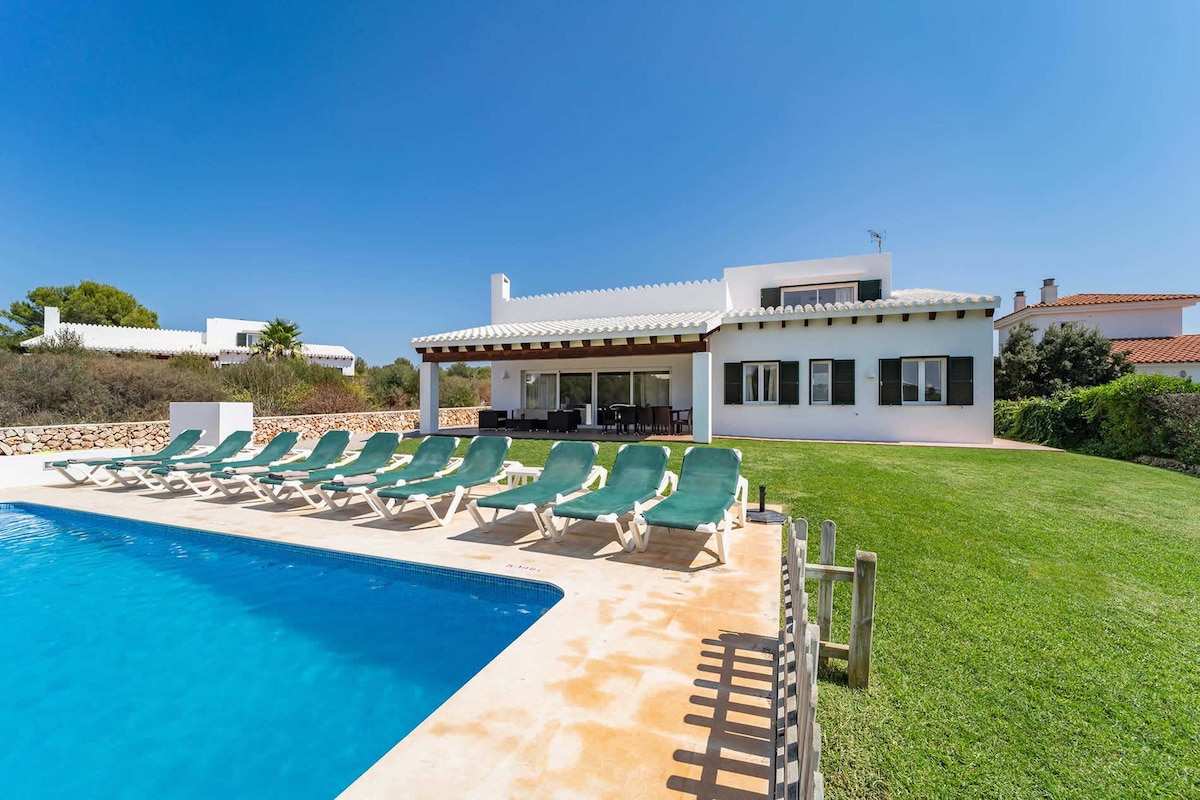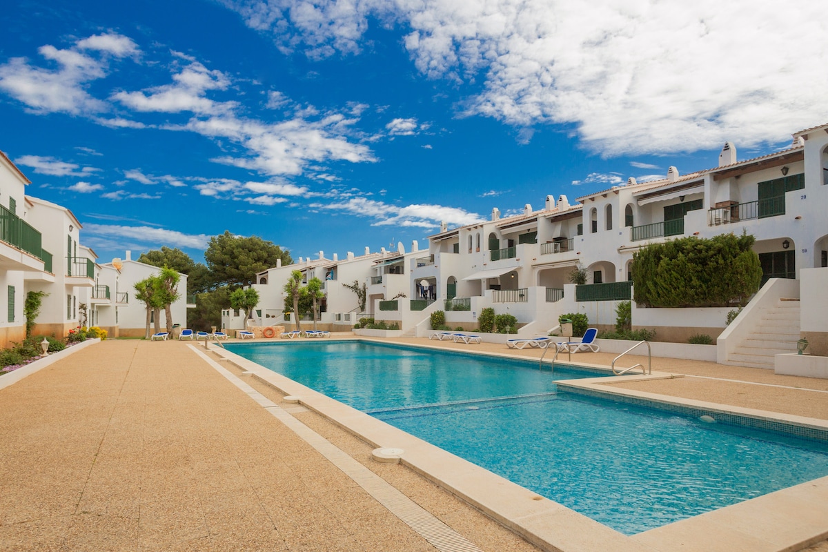 La casa Julia B8 vous accueille en couple ou en famille (1 couple + 3 enfants ou 2 couples + 1 enfant de plus de 6 ans ou un bébé). Grande terrasse de privative sans vis à vis, bel espace piscine communautaire. Equipée haut de gamme, décoration récente. La Cala est à 400 m, accessible à pieds, le port de plaisance à 100 m. Situation idéale pour découvrir Minorque, réserve de la biosfère (Unesco): Proche des plus belles plages du sud de l'Ile et du Cami de Cavalls pour les randonneurs!