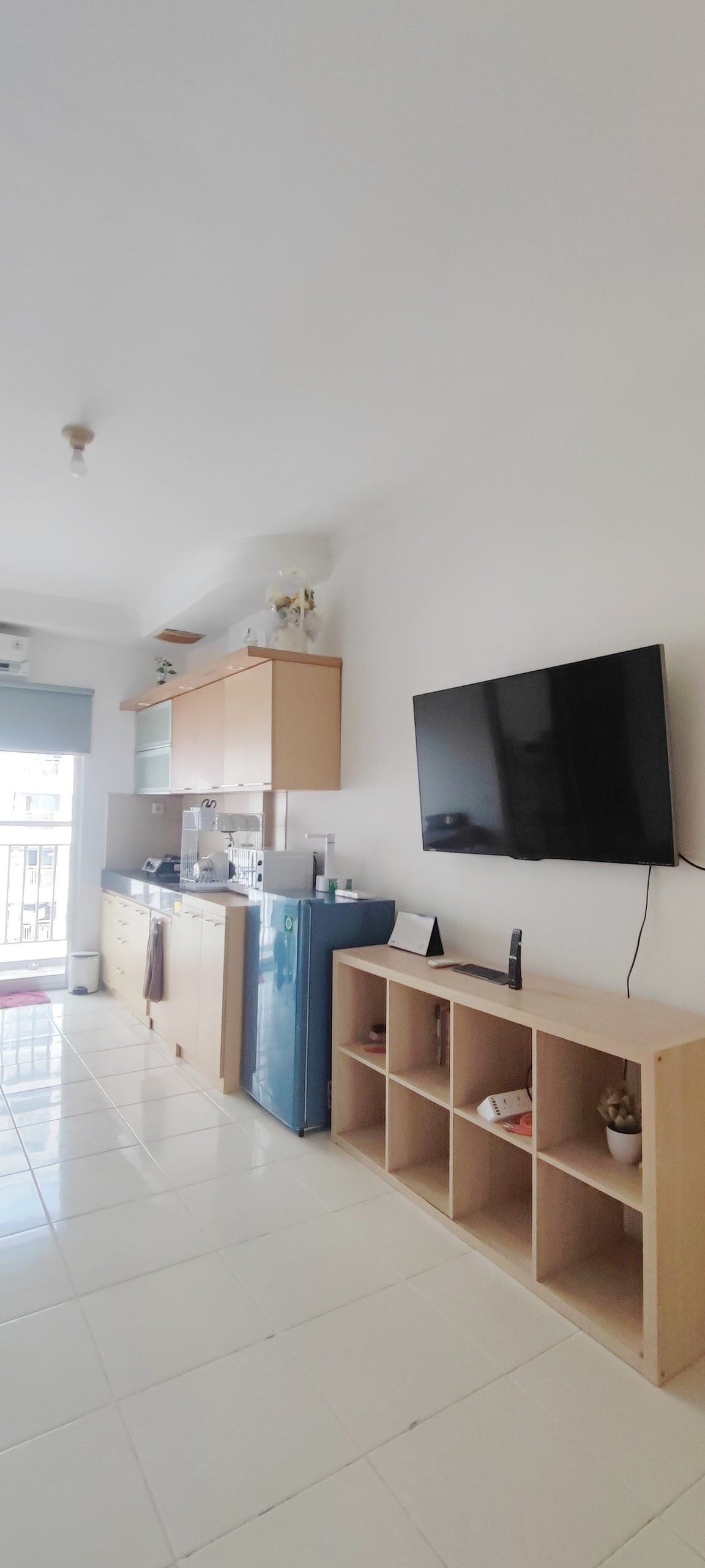 An elegant 24sqm studio in Jakarta's center, blending style and convenience. Includes kitchen, fast Wi-Fi, air-purification, 43" smart TV, sound system and Netflix. It is ideal for various stay types, with contactless access and amenities like pools, jacuzzi, gym, and basketball, Now features a Reverse Osmosis dispenser & food waste disposal, The picture shows a gas stove that has been replaced by an induction cooker (to follow the apartment guidelines for fire hazards)
