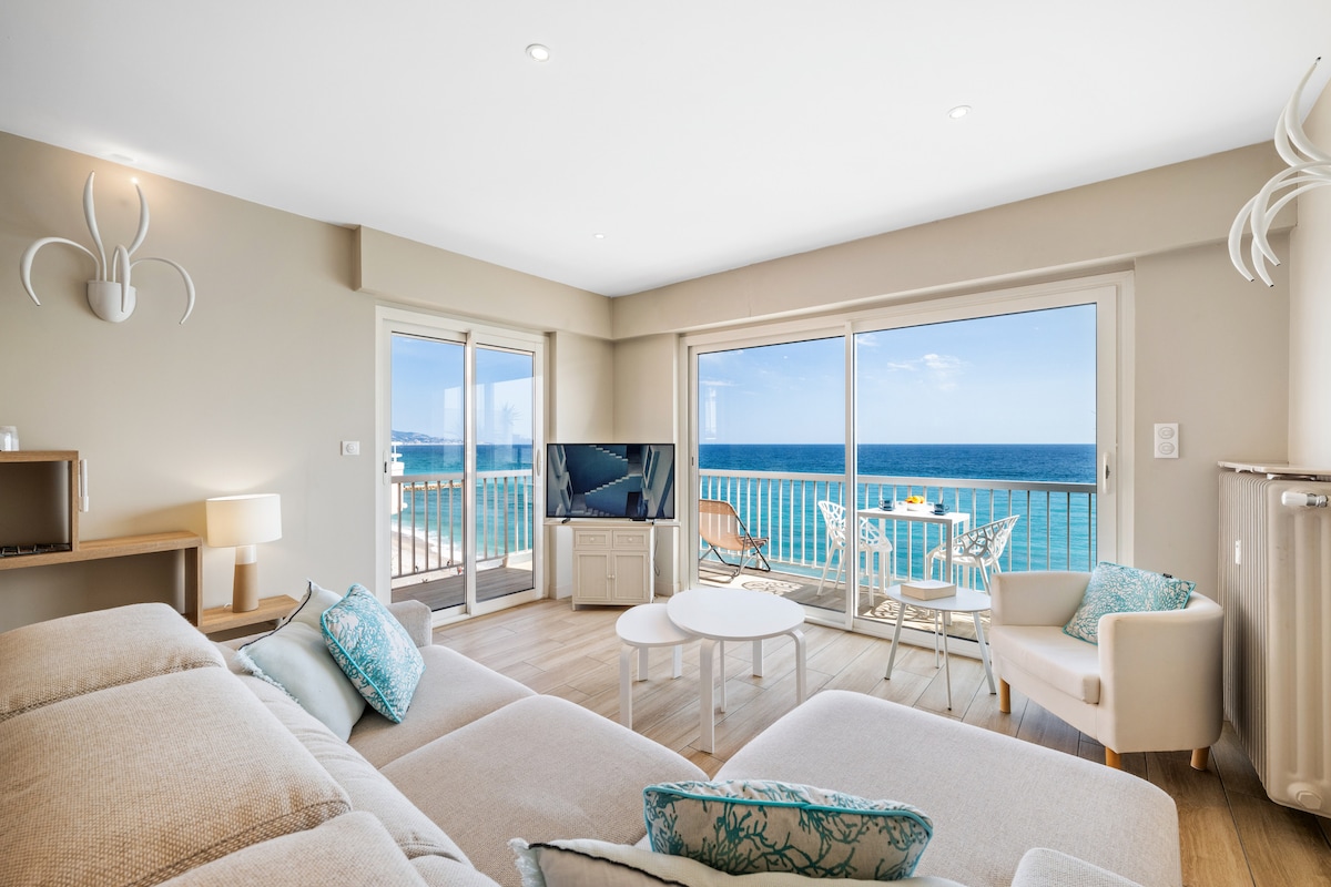 « SEAVIEWS BY JENNI MENTON »présente: Superbe 2 Pièces NEUF en Front de Mer, sur la Promenade du Soleil. 50 m2 de design,large terrasse de 18m2, vue mer comme sur un bateau de tout l'appartement. Conçu pour le confort de 4 personnes. Décoration très recherchée,matériaux et équipements haut de gamme. GARAGE FERMÉ* ASCENSEUR CLIM SMART TV INTERNET ILLIMITÉ HAUT DÉBIT ENCEINTE BLUETOOTH BOSE A quelques minutes à pied de tous les commerces et activités. Bus en bas de la résidence, gare à pied.