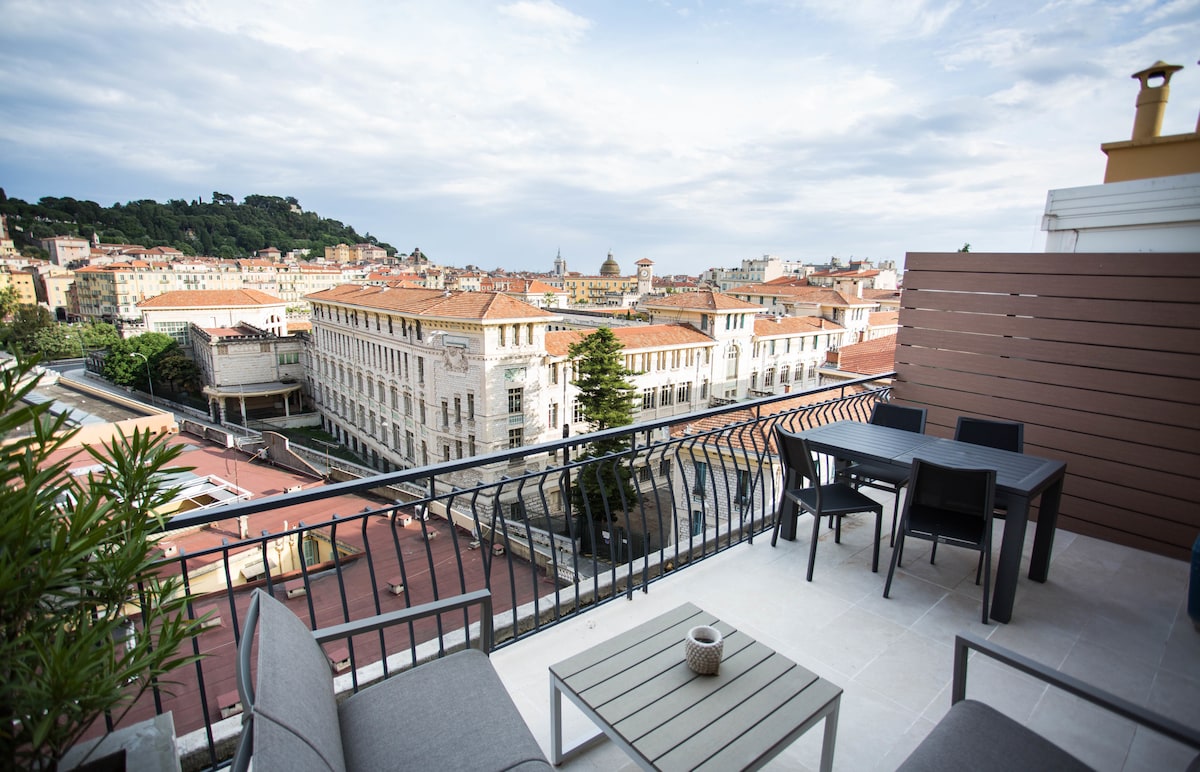 Make your stay in Nice memorable and hassle-free. This newly-renovated luxurious apartment in Nice’s Center within walking distance of the city centre, Old Nice, and the Palais des Congrès. Sip your evening cocktails listening to the church bells while enjoying the spacious, fifth-floor terrace overlooking the roofscapes of Nice with the mountains in the distance. Read below for more charming details.
