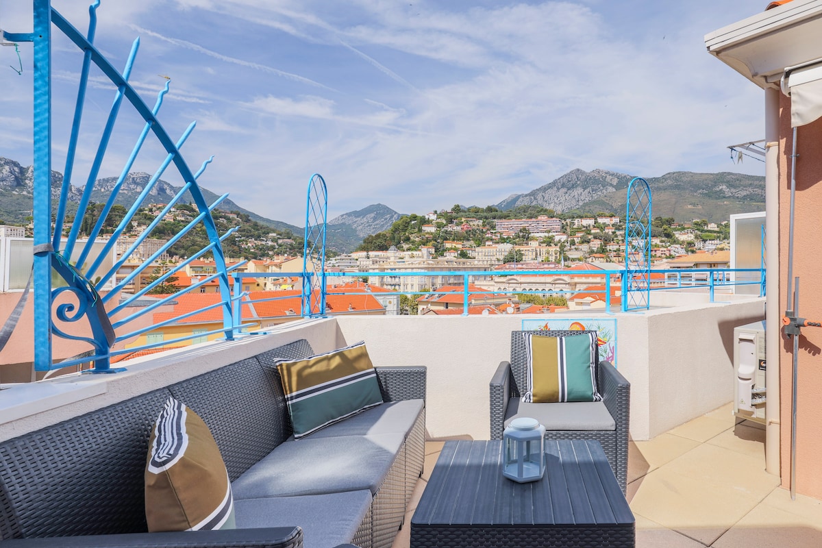 Beautiful apartment located in the heart of Menton (the lemon capital). 1 bedroom apartment of 35m², up to 4 people (1 queen size bed + 1 sofabed in the living-room). Fully furnished and eqquiped apartment, you'll just have to open your luggages and enjoy a peaceful breakfast on the 22m² terrace with a spectacular view on the city and the mountains. Beach is just across the street. Private garage inside the building. Bus stop right in front of the building. Train station is 8 minutes by walk.