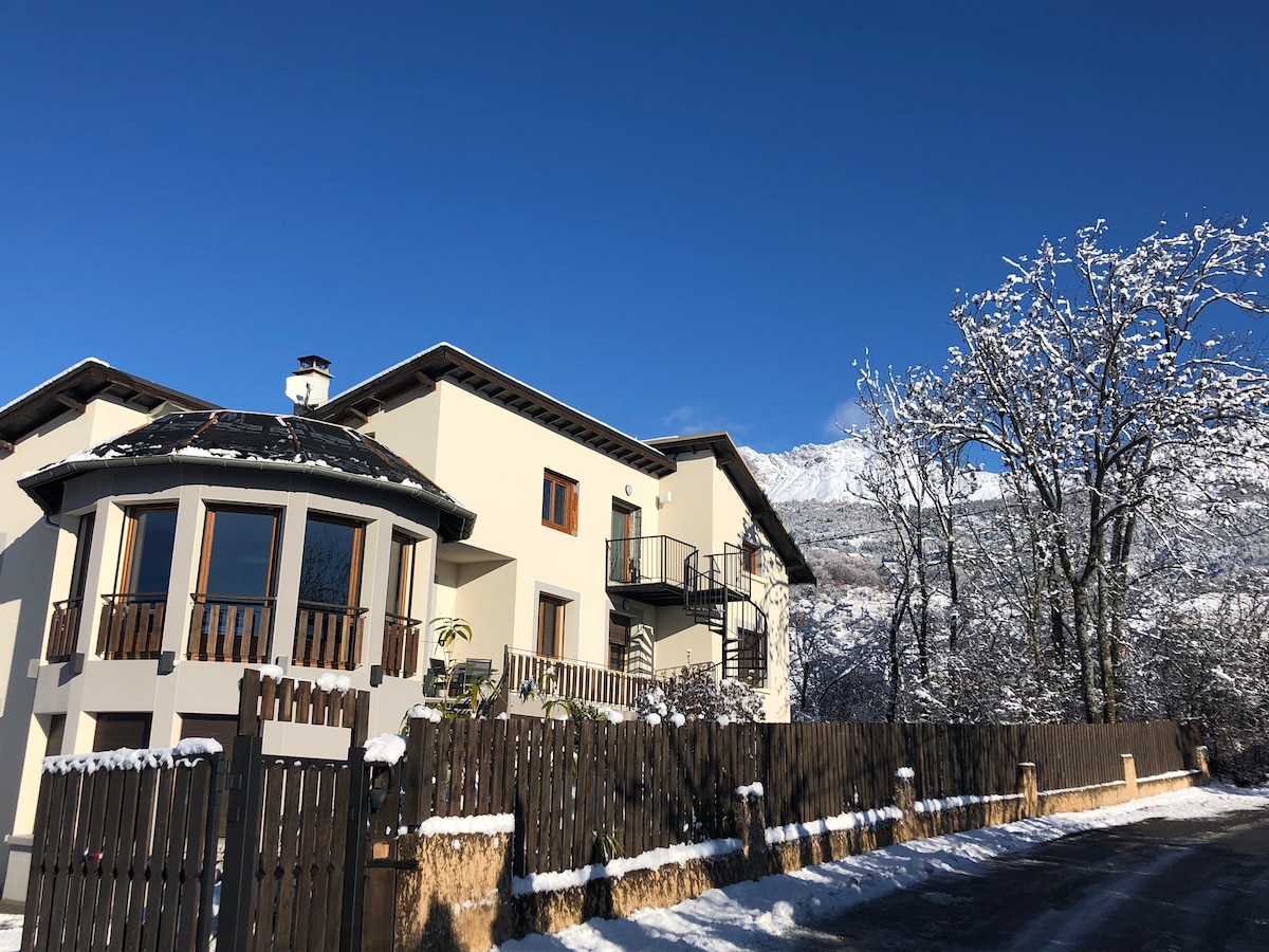 位于滑雪道下方的舒适公寓。可使用游泳池