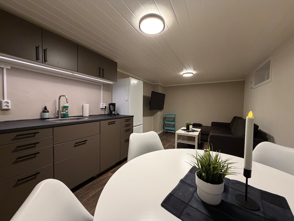 Fredelig leilighet 25 meter fra sjøkanten med nydelig utsikt og sentral plassering i enden av blindvei. Gratis parkeringsplass, wifi og TV. Leiligheten er helt ny og består av bad, fullt utstyrt kjøkken/stue og et soverom med stor og god dobbeltseng. Utgang fra stue til egen terrasse med sitteplasser. Leiligheten har mye lysinnslipp med både vinduer og glassdør. Kort gange til togstasjon, Nord universitet, sykehus, butikker og restauranter. Sengetøy og håndklær inkludert. Kaffe og te.