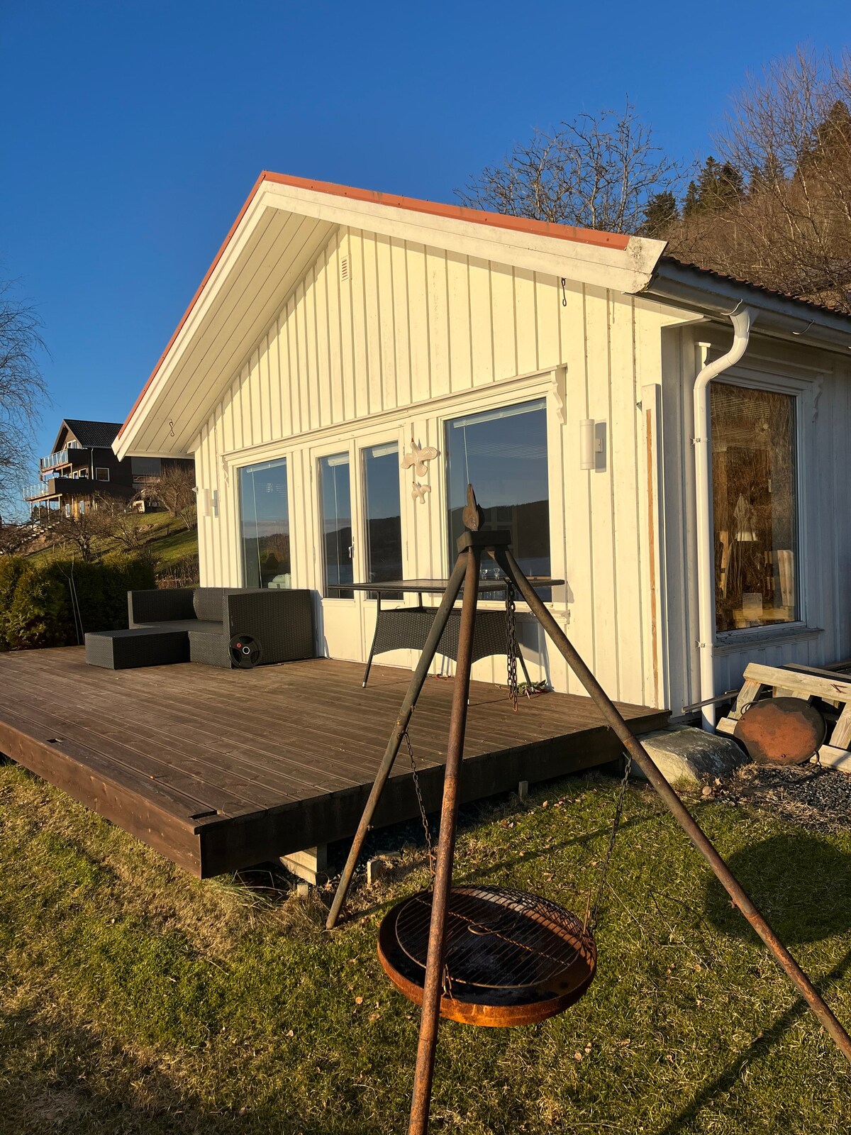 Dere vil ha tilgang til egen ute-terrasse som er skjermet fra resten av gårdstunet. Ute er det også en grillplass som fritt kan benyttes. Vi har også et tilstøtende bygg hvor det kan tilrettelegges for middagsselskaper. Kontakt meg gjerne om dere har behov for flere sengeplasser enn 3, vi har flere muligheter.