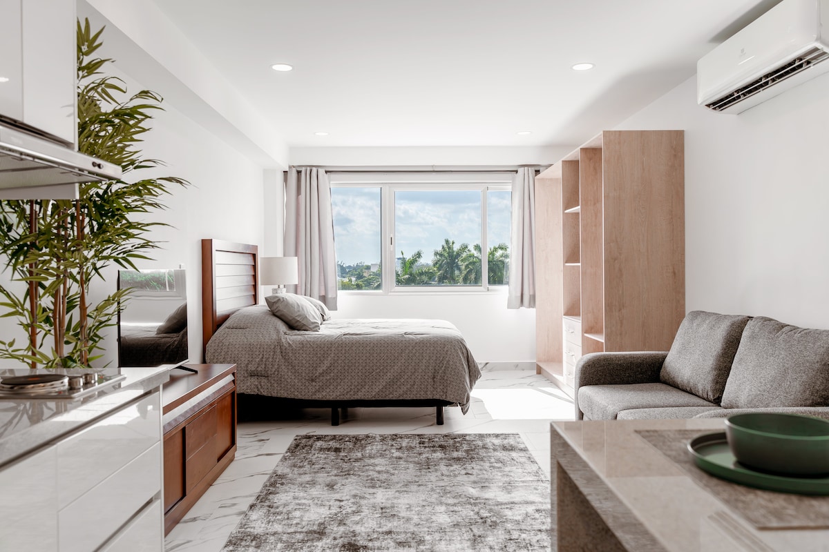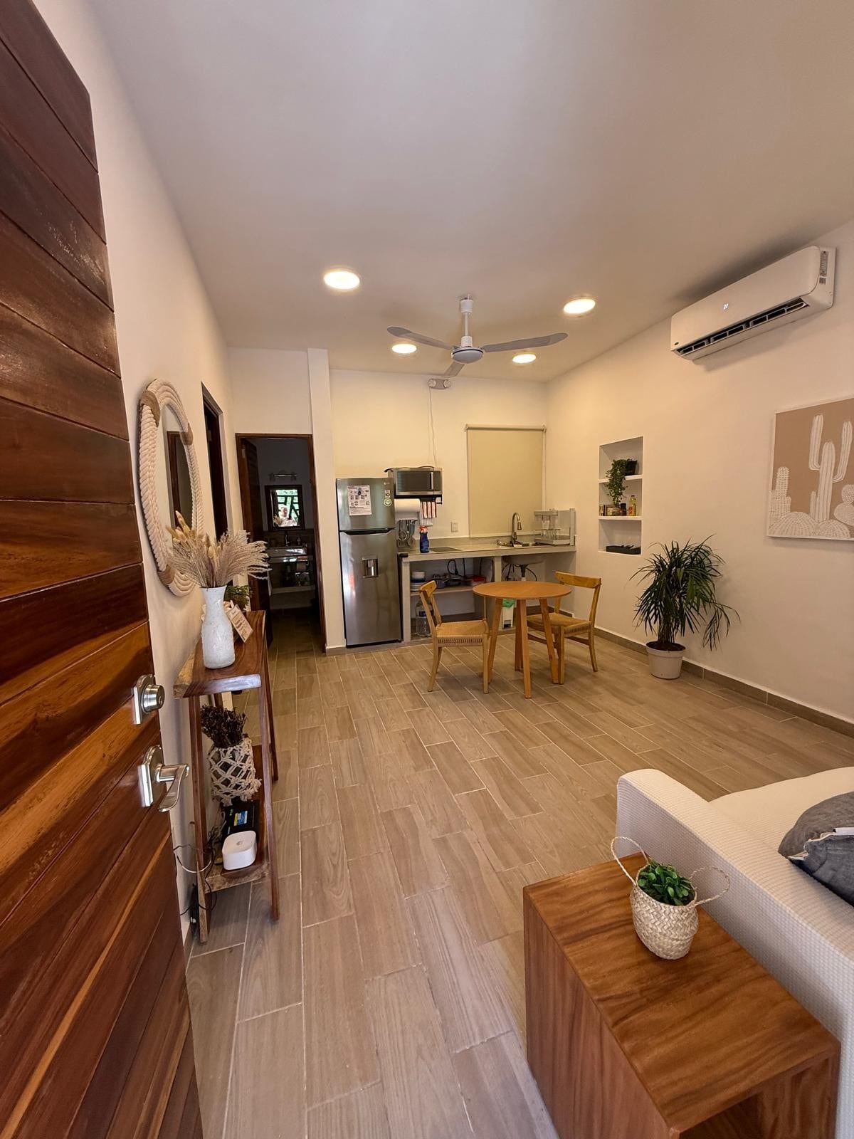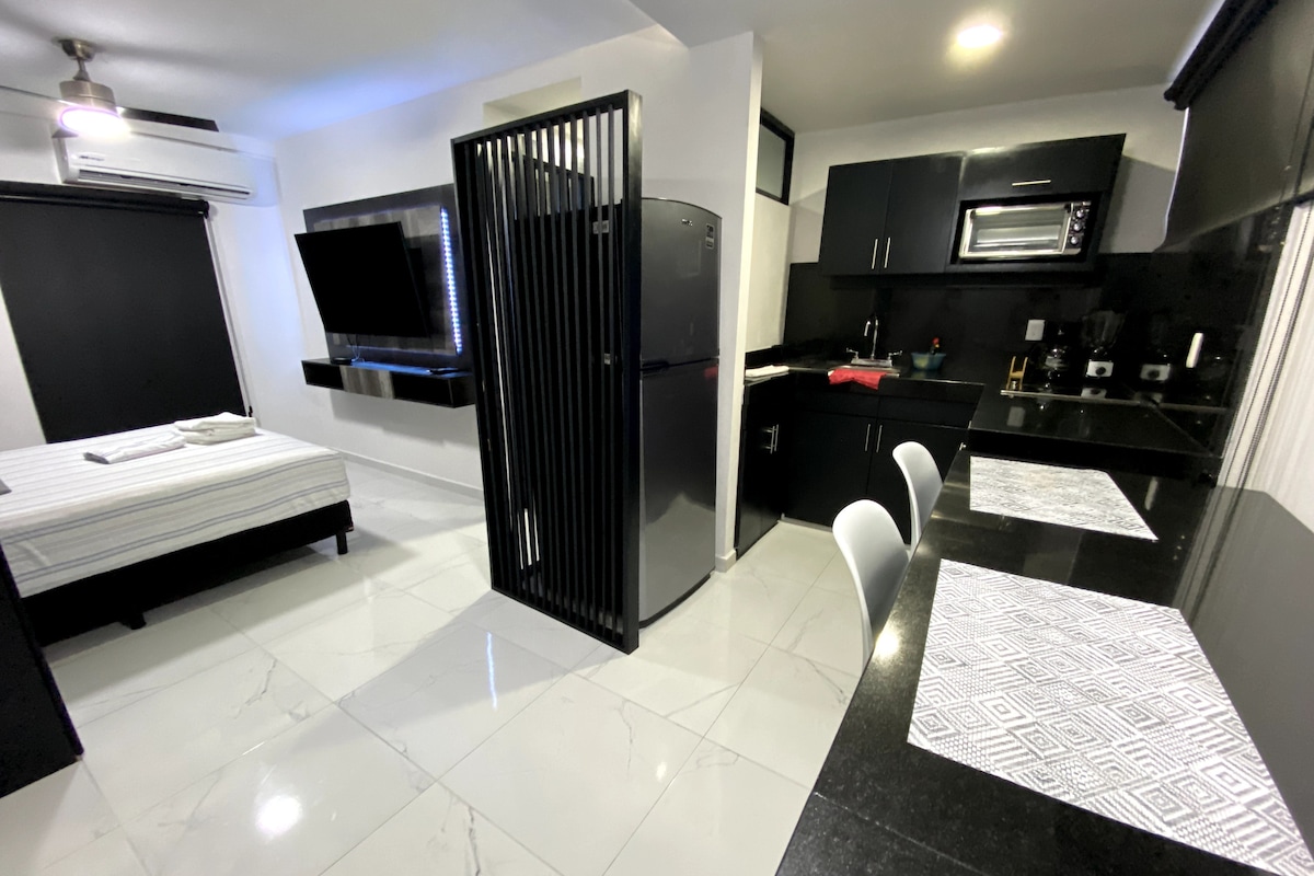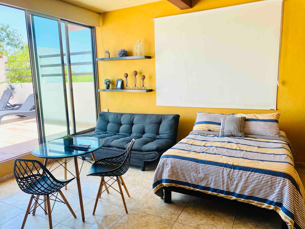 Maravilloso estudio para una o dos personas(no niños) en una zona céntrica y tranquila de Cancun. Cómodo, luminoso y muy bonito(nuevo). Tiene todo lo esencial para tu estancia en Cancun: TV con cable y Netflix, Aire Acondicionado, Wifi, Cocineta con refrigerador, alberca, top roof y mas amenidades. A pocos minutos caminando hay plaza comercial, restaurante, tiendas y transporte publico a dos calles para la ir a la zona hotelera y playas publicas. Todo lo necesario para sentirse como en casa.