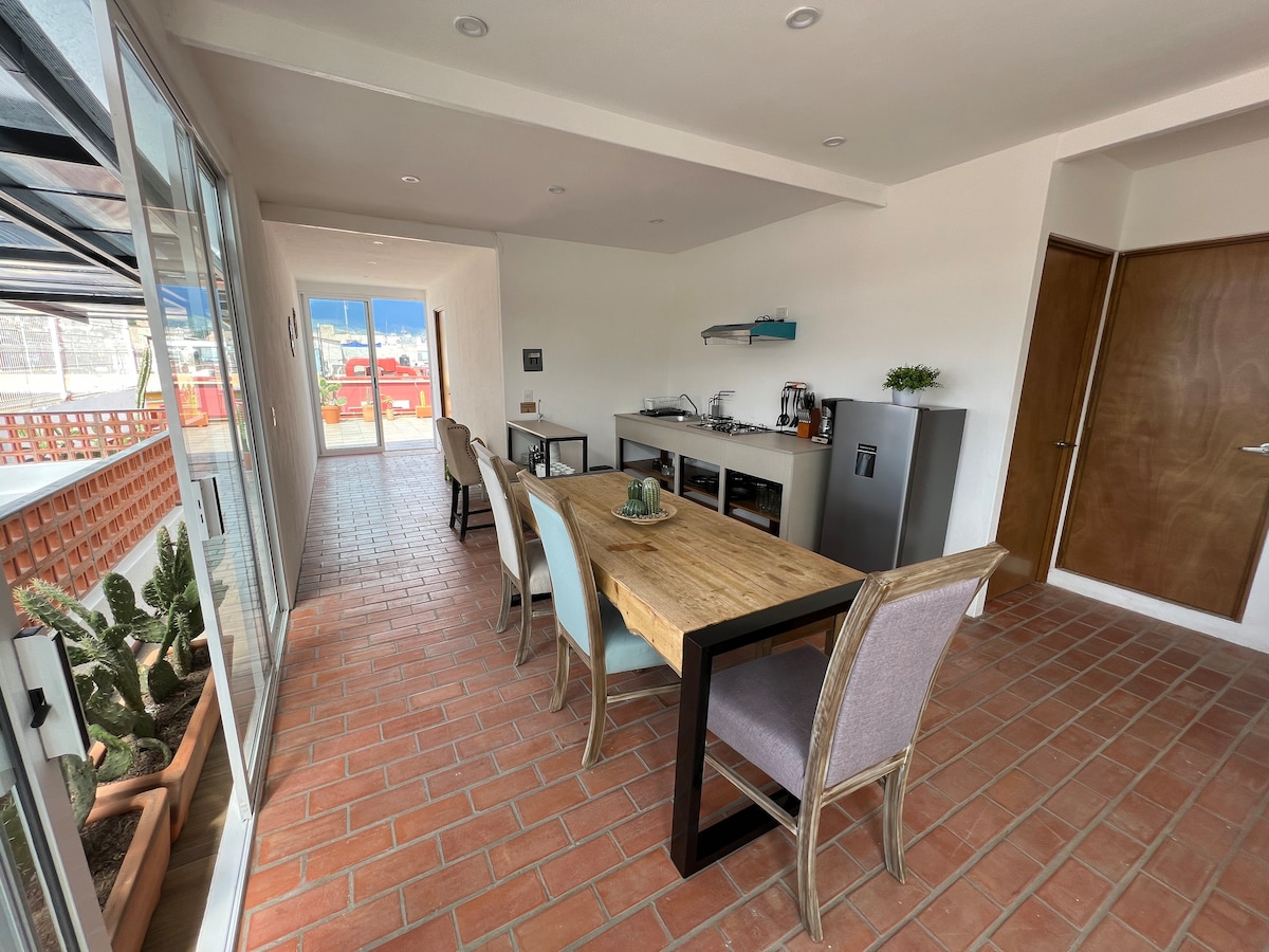 Nuevo Loft para 6 personas con 3 habitaciones, 2 baños, cocina equipada, sala comedor y gran terraza en el Centro de Oaxaca. A pocos metros del Mercado Gastronómico y el Mercado de Artesanías y a solo 3 cuadras del Zócalo. Estacionamiento gratis 24 hrs a 3 calles del departamento.