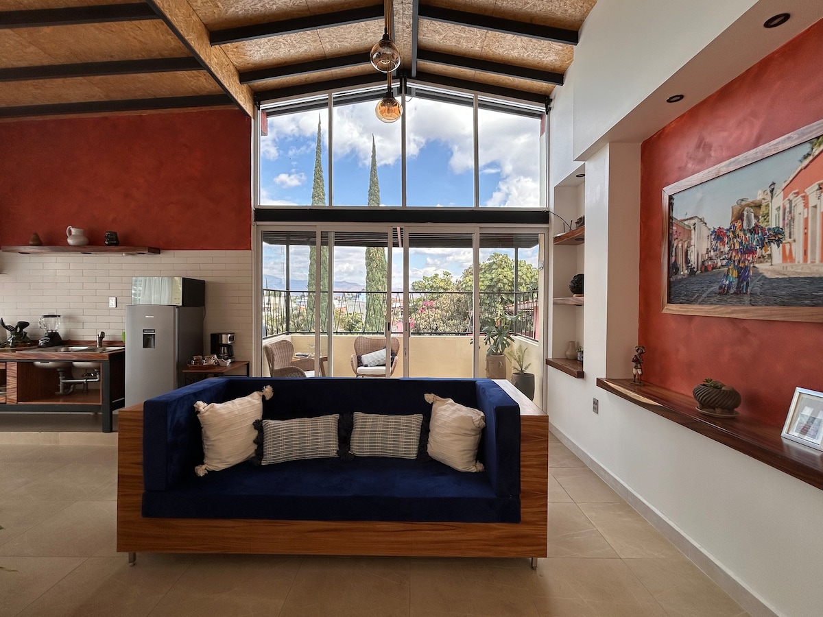 Nuevo Loft para 6 personas con 3 habitaciones, 2 baños, cocina equipada, sala comedor y gran terraza en el Centro de Oaxaca. A pocos metros del Mercado Gastronómico y el Mercado de Artesanías y a solo 3 cuadras del Zócalo. Estacionamiento gratis 24 hrs a 3 calles del departamento.