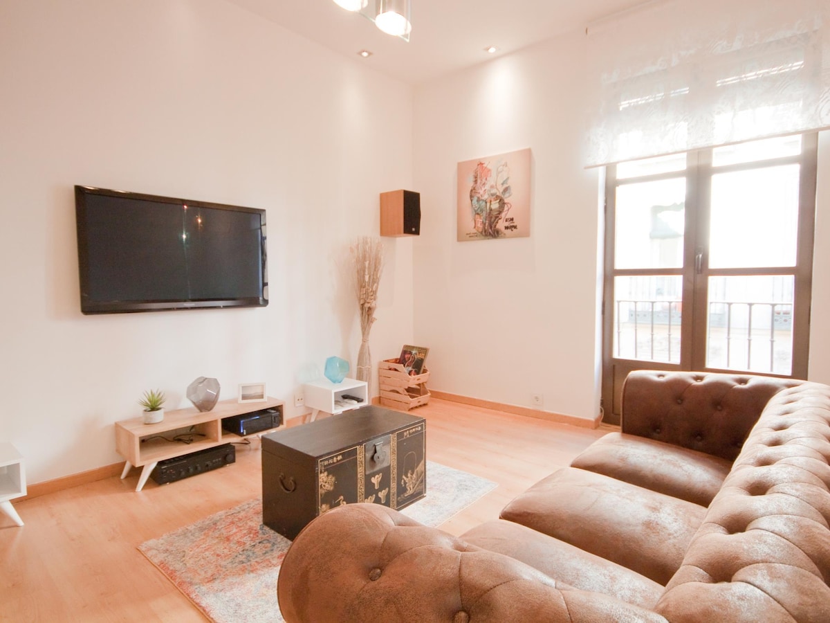 NO SELF CHECK IN, IMPERATIVE TO GIVE ARRIVAL TIMING. Beautiful and cozy old apartment in old style with balcony to Mayor square, beautiful views to the sunset, but quiet and spacious. AC in all the bedrooms and gas heating. WIFI and basic supplies (shower gel, toilet paper, towels, sugar and salt, etc)