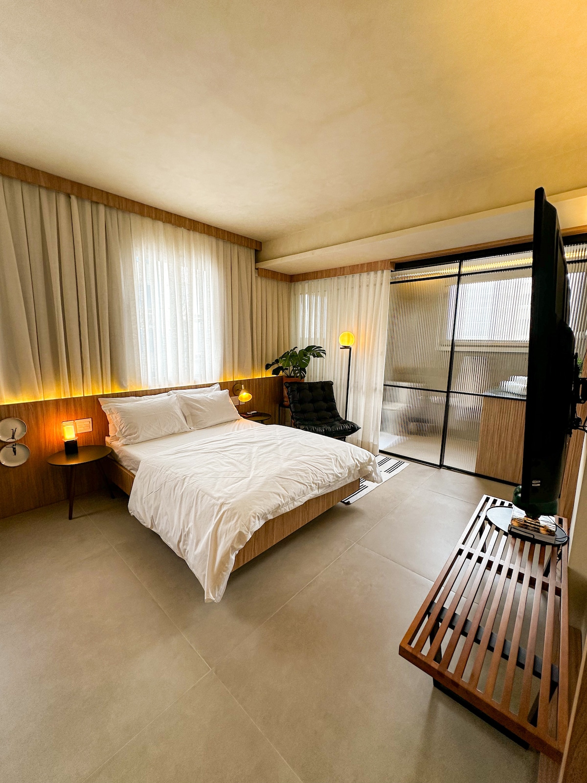 We understand that life is full of comings and goings, and we believe that the concept of home doesn't have to be fixed or definitive. The important thing is to provide a space where you can feel comfortable and free to live your way. Our studios have been designed with attention to detail, so that you can make this your home. The 44m² studio has a QUEEN bed, a SINGLE sofa bed, a 43” Smart TV and AC SPLIT.