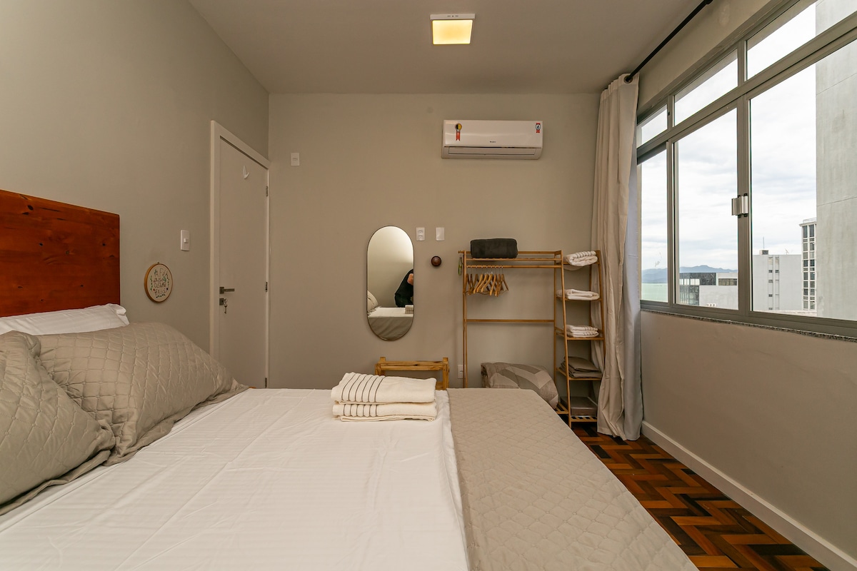 Aproveite a localização privilegiada deste apartamento, em frente ao Centro Sul, com vista para o mar e as pontes que ligam a ilha ao continente (Ponte Hercílio Luz). Equipado, o imóvel oferece 1 quarto, sala, cozinha e Wi-Fi. A poucos minutos do Mercado Público e da Beira-Mar, é ideal para quem participa de eventos ou deseja explorar a cidade. O apartamento possui 1 quarto com cama queen, um sofá cama na sala e um colchão de solteiro. Todos os cômodos possuem ar condicionado.