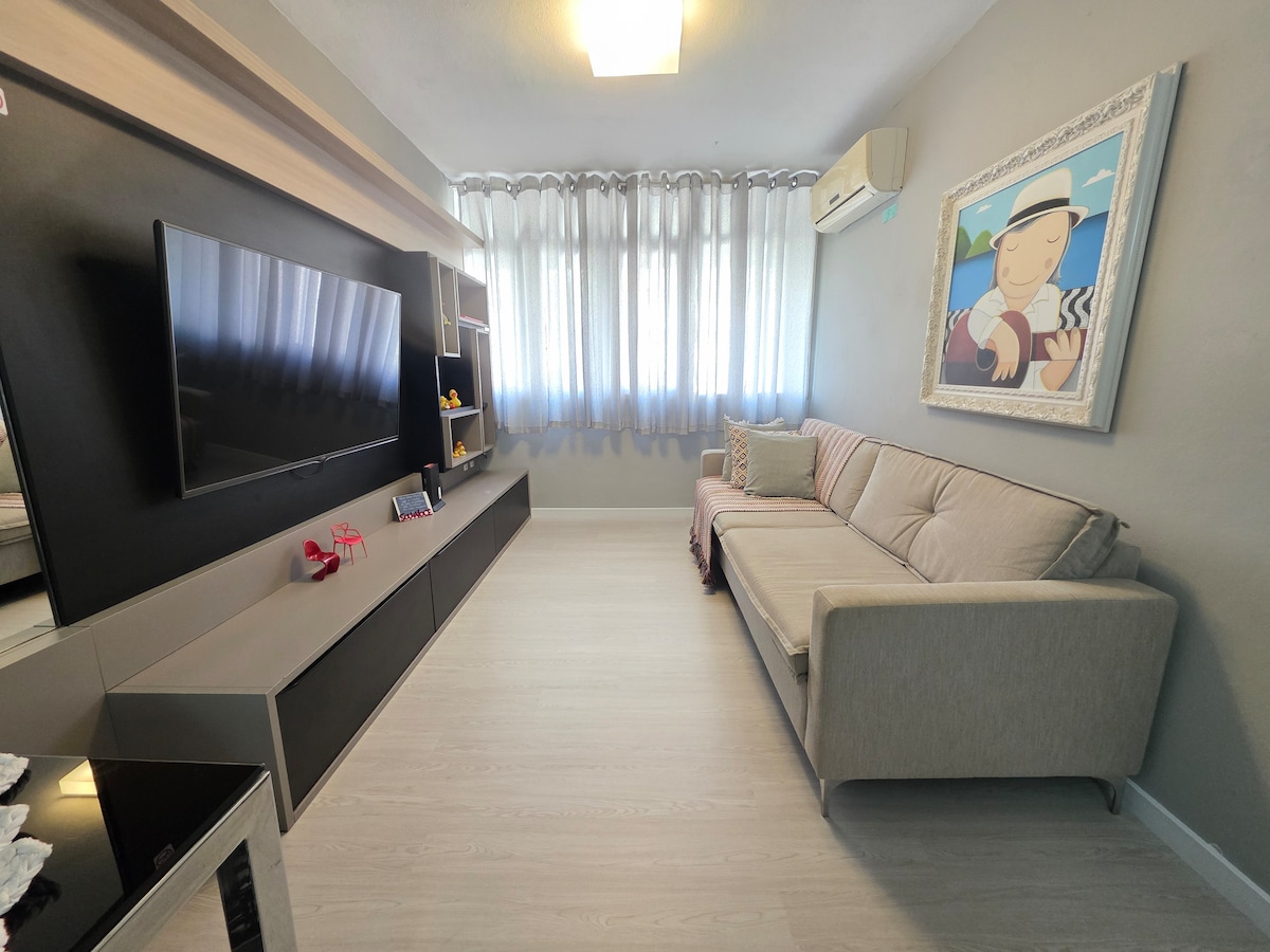 Apartamento no CENTRO da ilha, em Florianópolis. 2 DORMITÓRIOS. 4 PESSOAS. 1 GARAGEM. Ambientes climatizados. Check-in as 15h. Check-out as 10h. Obs: NÃO aceitamos visitantes. 1 cama Queen, 2 camas de solteiro, Cozinha americana, Banheiro social, Sala de estar, Tv 55", Wi-Fi 500 MB. Próximo: Av. Beira-mar norte CENTRO de Convenções Mercado Público Supermercado Angeloni Padarias e Farmácias Restaurantes CORTESIAS: Café de boas vindas, água com gás. suco, chá e bombons.