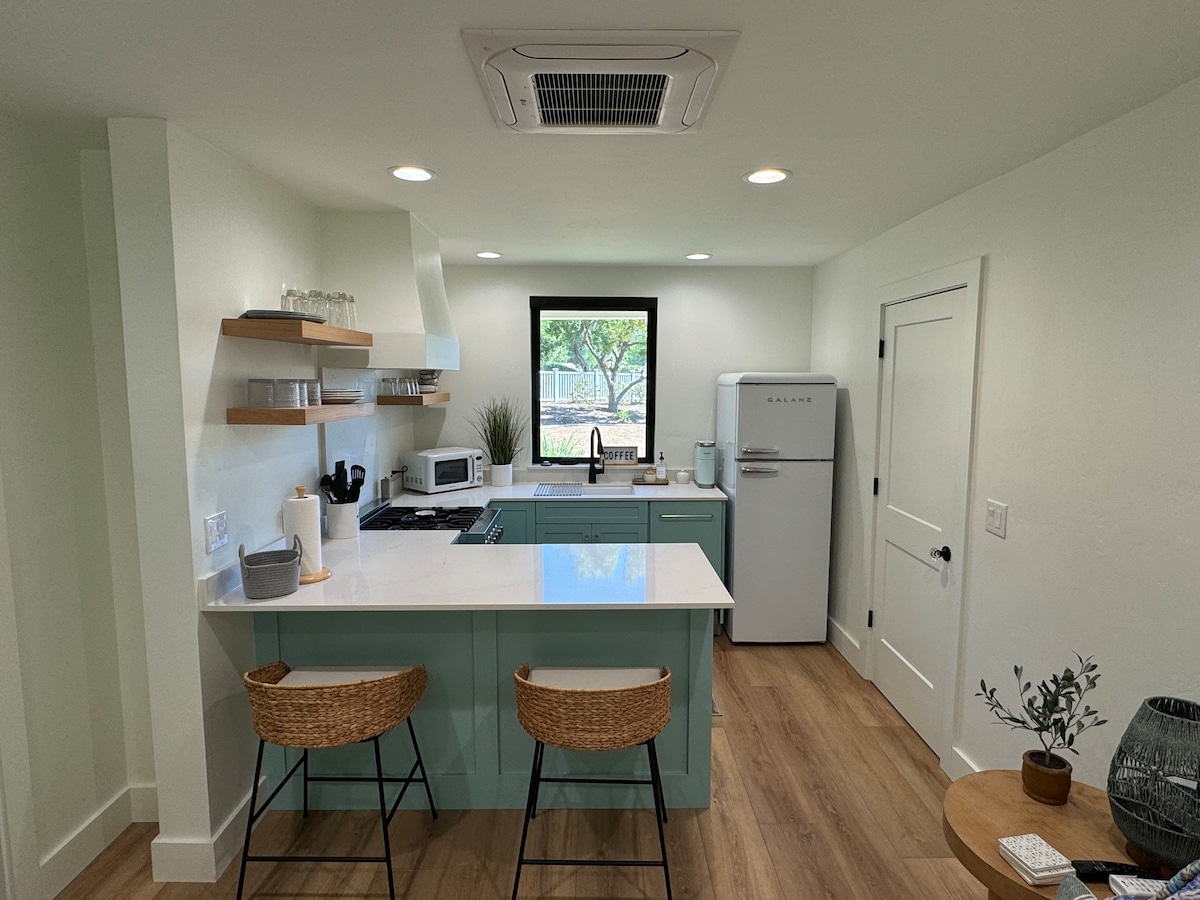 Enjoy this private guest suite with a dedicated entrance to yourself. Kitchenette is equipped with basics, including a microwave+, a one burner convection stove top, a full size refrigerator with ice maker, and a portable kitchen island on wheels with a butcher block. This mini-like apartment is located within a newly constructed neighborhood and is in close proximity to a private park/sports complex.