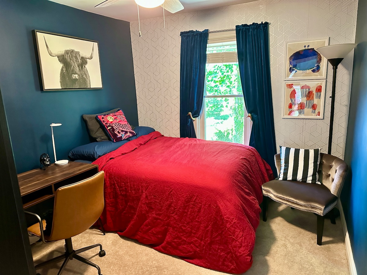 We love making our place feel extra cozy for the holidays and can’t wait to host you this winter! Our Cottage is a standalone guest house situated on our 4-acre property. Away from the main house, It offers ample privacy. The loft bedroom (not childproof) can be reached via an easy-to-climb staircase. The KING SIZE bed ensures a restful night and is perfect for a lazy morning. Features include a kitchenette, electric fireplace, BBQ, outdoor fire pit (with wood), covered patio, and a smart TV.