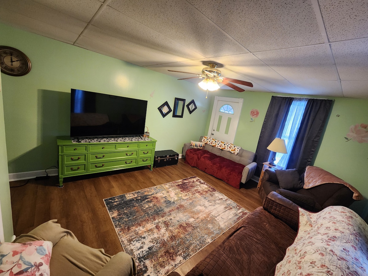 Country setting surrounded by working farms. We offer a two bedroom home with very large screened-in porch. Enjoy morning coffee on the porch as you watch the cows come in. Very peaceful, quiet setting with large yard. Get a retro feel in the pink bathroom. Recently upgraded laminate flooring throughout the house. Eat on China plates in the formal dining room or use paper plates with access to a grill. Less than 15 minutes to the Grove city outlets and 6 miles to the state game lands.