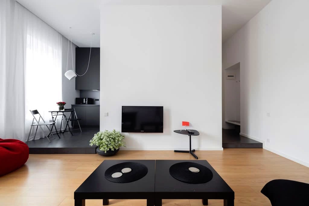 INDUSTRIAL Studio in old soviet building designed by "VIRSTAK", brings unique atmosphere with spectacular day and night CITY VIEW enjoyable from the BATHTUB. -100% HANDMADE. - Not a RANDOM cozy/ functional apartment, Studios amenities consists of old vintage and industrial furniture, for some people might feel uncomfortable out coming from a personal taste. Artistic vibe making you feel like in movies. - WINERY - 9 SORTS of wine - Movie Projector Airport pickup Suzuki Swift 80 Gel