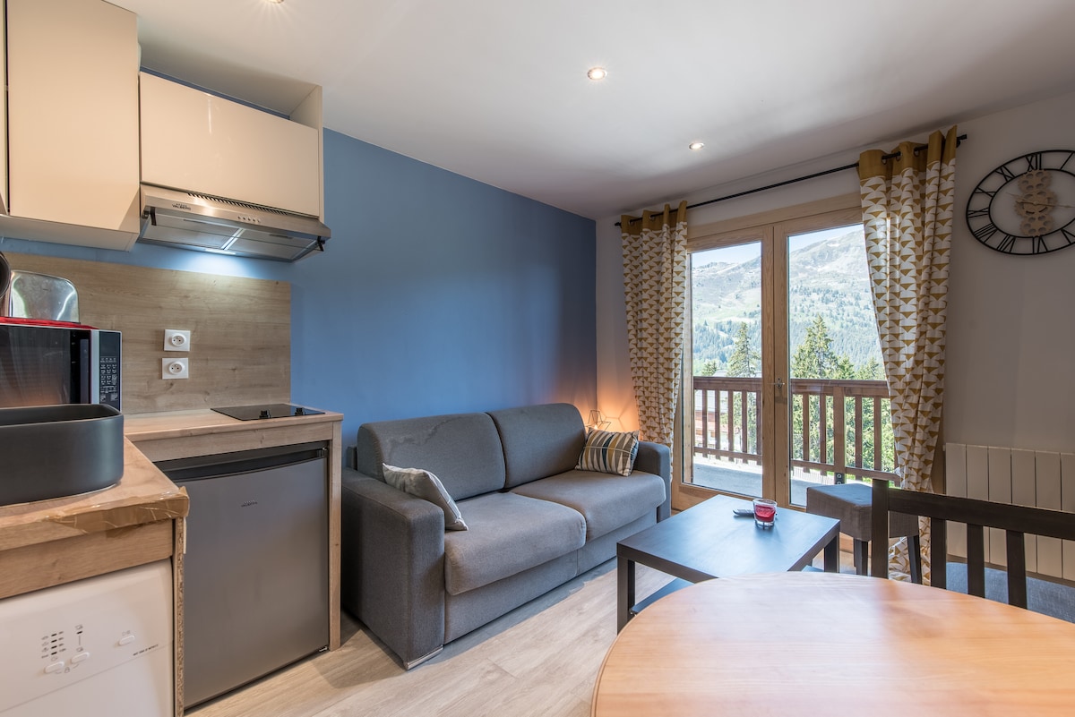 Entièrement rénové, cet appartement chaleureux skis aux pieds, peut accueillir jusqu’à cinq personnes (maximum 4 adultes) avec son séjour disposant d’un canapé lit deux couchages et de sa chambre, sa cuisine équipée d’un four combiné micro-ondes, d’une machine à laver séchante, d’un lave-vaisselle, vous permettra d’organiser votre séjour avec sérénité. Profitez d’une résidence offrant une supérette, un restaurant et un magasin de sport (fermés l’été). À proximité du parking couvert P2