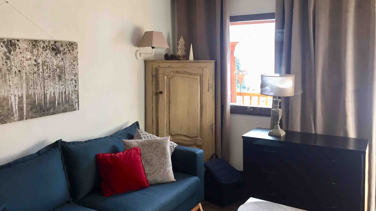 Superbe appartement de 36 m2 avec balcon, 1 chambre, 1 séjour avec cuisine (four combiné, lave vaisselle), 1 salle de bains avec lave linge séchant, 1 Wc, 1 casier à skis. Très bien équipé en électroménager (grille pain, cafetière Nespresso, bouilloire électrique etc...). Situation dans la rue principale de la station (commerces, bars, restaurants, magasins de skis et vêtements). Accès aux pistes (100 m). Décoration cosy, un véritable nid douillet très confortable.