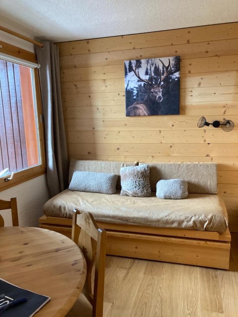 Appartement aux pieds des pistes résidence à Meribel Mottaret accès direct aux pistes des 3 vallées courchevel val Thorens Proche tous commerces Balcon sud Avec son coin montagne séparé par deux portes couloir, l'appartement peut accueillir confortablement 4 personnes : couchage privatisé 1 lit mezzanine 2 pers coin montagne 1 lit d appoint 1 pers coin montagne 1 lit canapé convertible cote séjour Parking gratuit Navette gratuite pour Meribel centre draps serviettes ménage compris