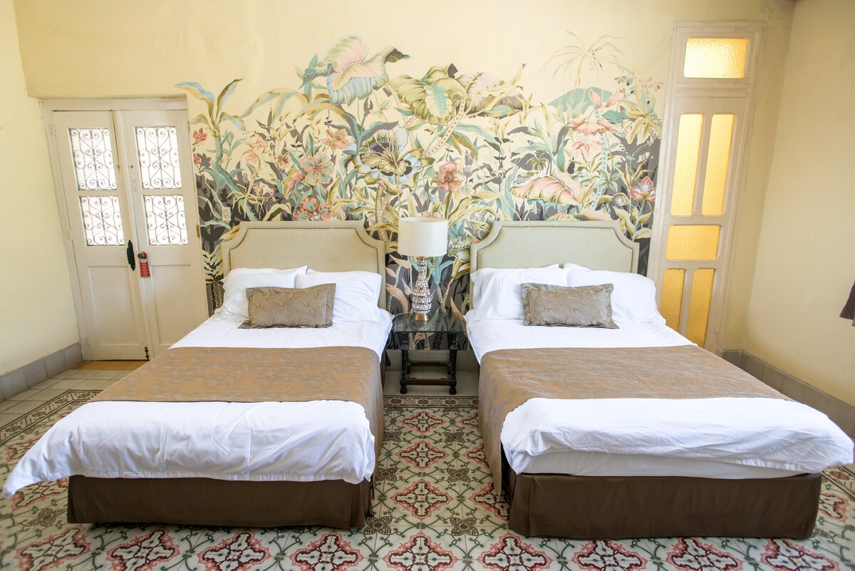 Lovely spacious room on ground floor with luxurious twin beds , imported sheets ,duvets. Very large bathroom with shower. This room opens onto a lush interior patio, has 18ft ceilings, hand painted walls, antique furniture and handmade pasta floors. The rate includes a gourmet breakfast , free wifi, ceiling fans, air conditioner and free mini bar that has purfied water, beer and refreshments. There is a shared plunge pool. Every night there is a free tequila tasting at sunset on the roof!