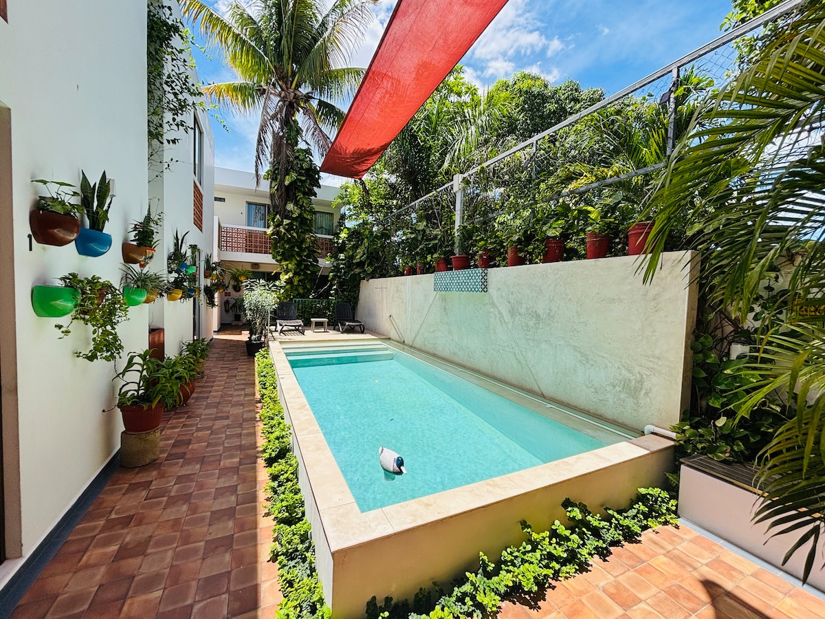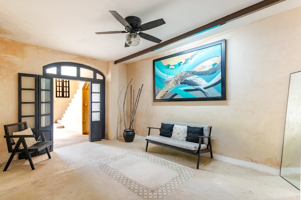 Spacious King-Size bedroom designed to offer comfort, private bathroom, AC, and décor inspired by the charming blend of Yucatecan colonial style and modern touches. Enjoy the shared pool, surrounded by lush greenery and a calm, refreshing atmosphere. You’ll also have access to inviting common areas where you can work, unwind, or simply soak in the relaxed vibe of this urban oasis. Perfect for couples, solo travelers, or anyone seeking comfort, style, and an authentic place to stay.