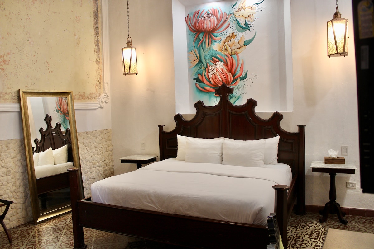King bed suite with private ensuite bath in upscale guest house that is near everything you want to visit. Wi-Fi, pool, courtyard, gardens, covered terrace for outdoor dining and working. 12-minute walk to old downtown & Calle 60 filled with trendy restaurants, & 20-minute walk to the famous Paso de Montejo zone. Renovated historic colonial guest house in the historical Centro district. Modern, hotel style, private guest quarters with ensuite bathrooms, and amenities.