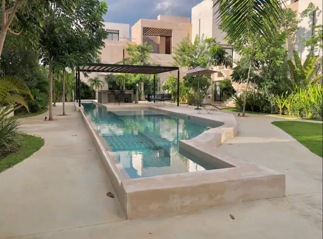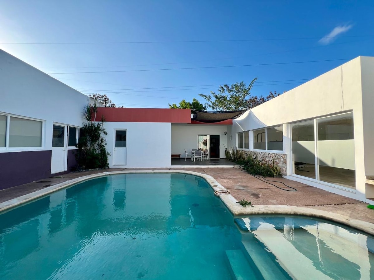 Beautiful house in Yucatan, with 3 bedrooms, the main one with a king size bed, hammock and bathroom with Jacuzzi, second bedroom with double bed and hammock, third bedroom with two single beds and hammock, plus sofa bed, nice garden with pool and terraces, just 3 blocks from the Great Museum of the Mayan World and the Siglo XXI Convention Center, 15 min. from the historic center and 20 min. of the beach. Located in a very safe residential area north of the city