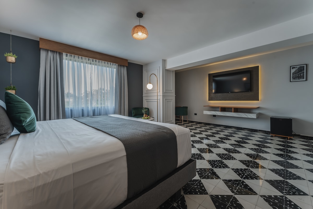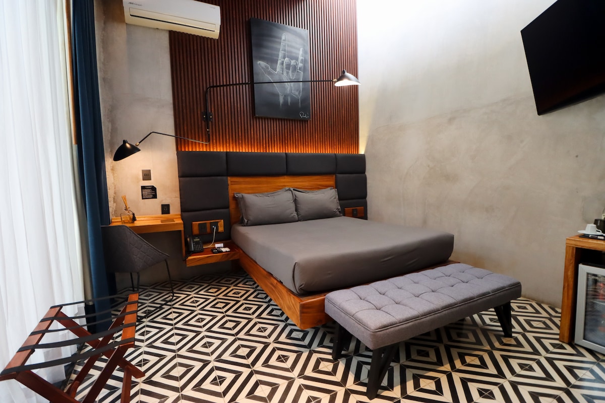 Bienvenidos a Näab, un refugio de tranquilidad y elegancia en el corazón de Mérida, Yucatán, donde la hospitalidad mexicana se fusiona con la esencia del bienestar holístico. Disfruta de nuestras instalaciones que incluyen un spa, un centro holístico y un rooftop ideal para relajarte con el aire fresco, contemplar el cielo estrellado o admirar el atardecer yucateco." La habitación cuenta con una cama king size, un sofá cama individual, frigobar, TV, aire acondicionado.