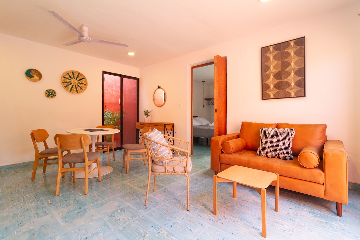 ¡Bienvenido a uno de los mejores hospedajes en el corazón de Mérida. Descubre diseño, funcionalidad y tranquilidad en un exclusivo departamento privado. Disfruta de una amplia sala con centro de TV, comedor junto a una cocina 100% equipada, un baño privado para uso personal. Relájate en la Suite con cama Kingsize y closet para tus pertenencias, cuenta con una mini piscina privada para relajarse. Nuestra energía proviene de paneles solares, demostrando nuestro compromiso con la sostenibilidad.