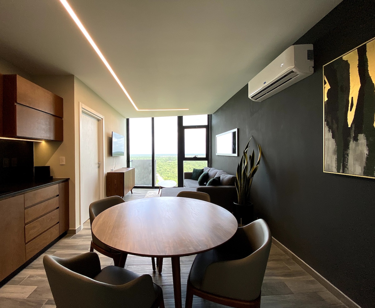 Loft en renta vacacional, ubicado en el piso 17, de Adamat Mérida, acondicionado para disfrutar de su vista desde cualquier ángulo , ya sea el comedor, sala o recámara, al interior del fraccionamiento residencial Cabo Norte donde encontrarás el más importante centro comercial de la ciudad, Plaza La Isla, a escasos 2 minutos caminando, además de lagos senderos para caminar, alberca, gimnasio, yoga room , game room, Sky Lounge, Roof garden y lavandería
