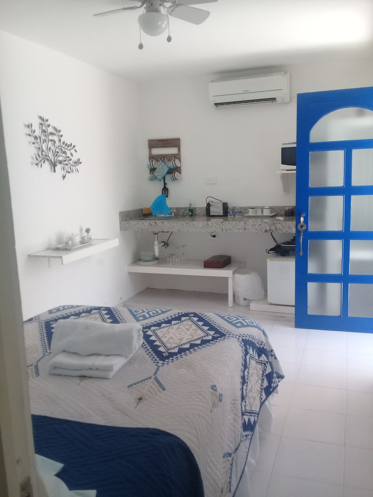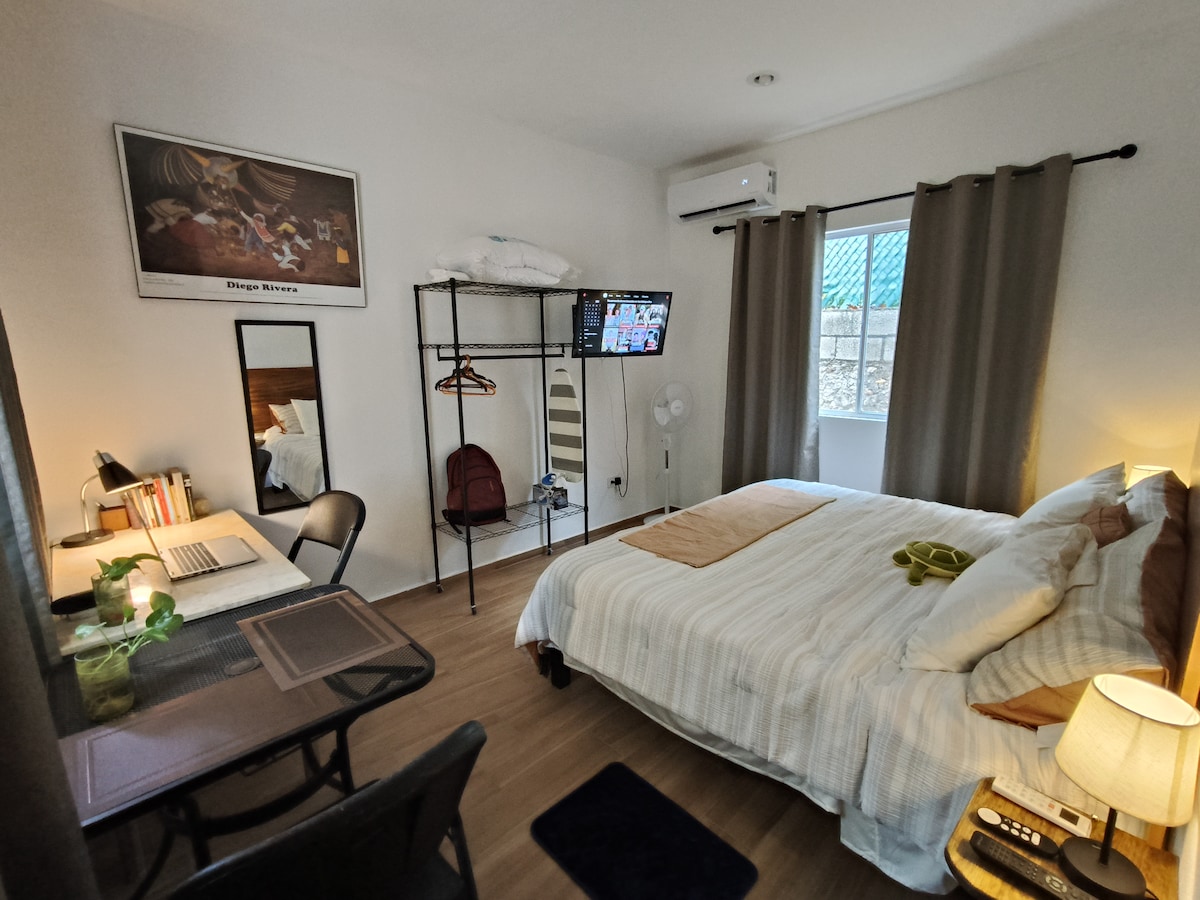 Small and cozy villa with contemporary Mexican design, with everything you need for long and short stays, ideal for resting or home office. Equipped with a full kitchen, living room, bathroom with hot water, air conditioning, fans, high-speed Wi-Fi, private patio with trees, swimming pool and shared laundry within the facilities. Excellent location, a few steps from Paseo Montejo near Walmart, banks, bars and restaurants.