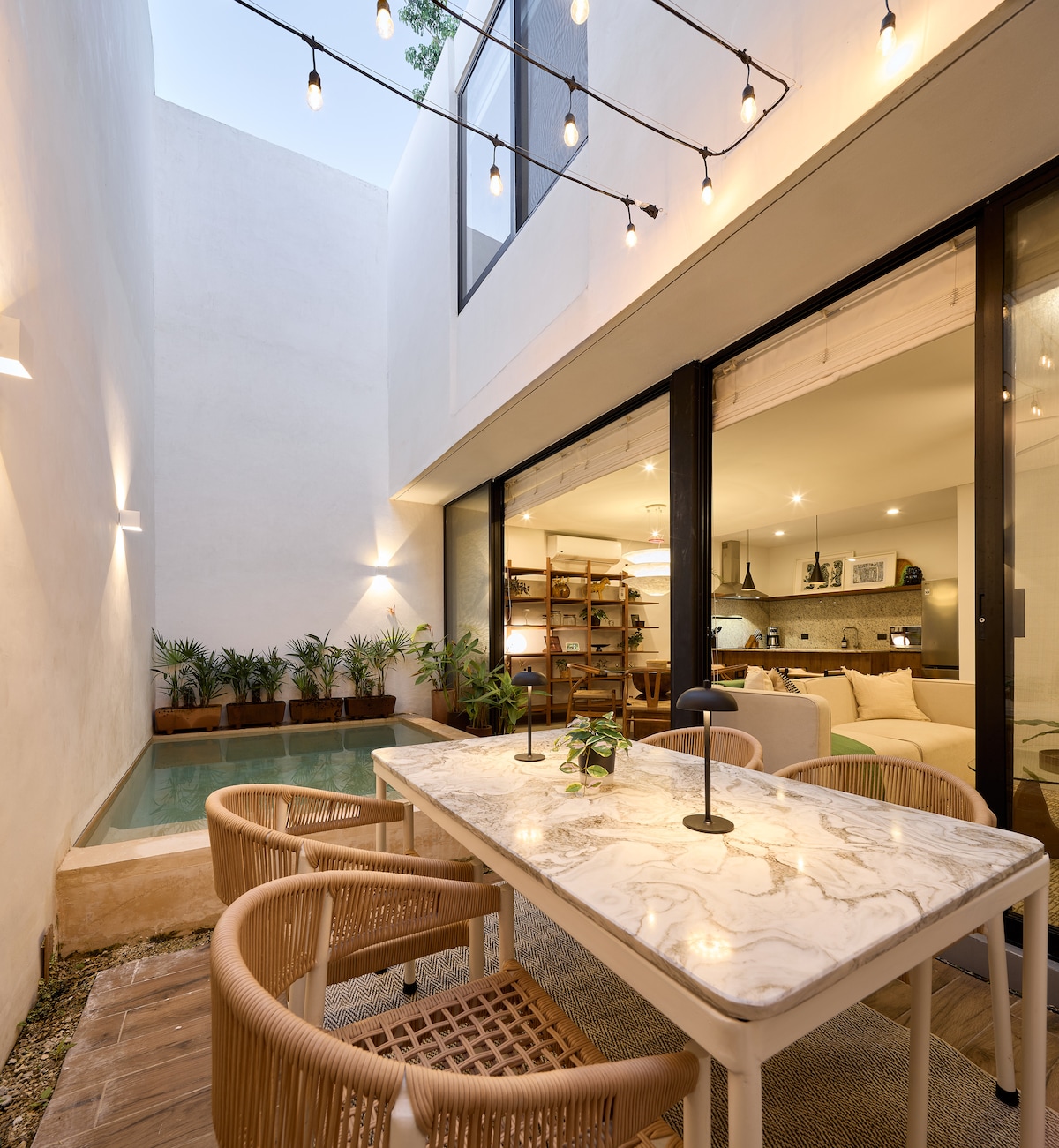 Bienvenidos a Casa Chi'ibal uj un refugio especial a solo 50 mts del Paseo de Montejo, a una cuadra del corredor gastronómico y a 4 del parque de la plancha. Ideal para 4 personas . cuenta con una habitación principal con cama king y baño. Disfruta de una cómoda sala con sofá cama matrimonial adicional. La cocina, totalmente equipada, abierta al exterior con barra y comedor para 4. Cuenta con terraza piscina y jardín donde puedes relajarte después de un día de aventuras . Todo climatizado.
