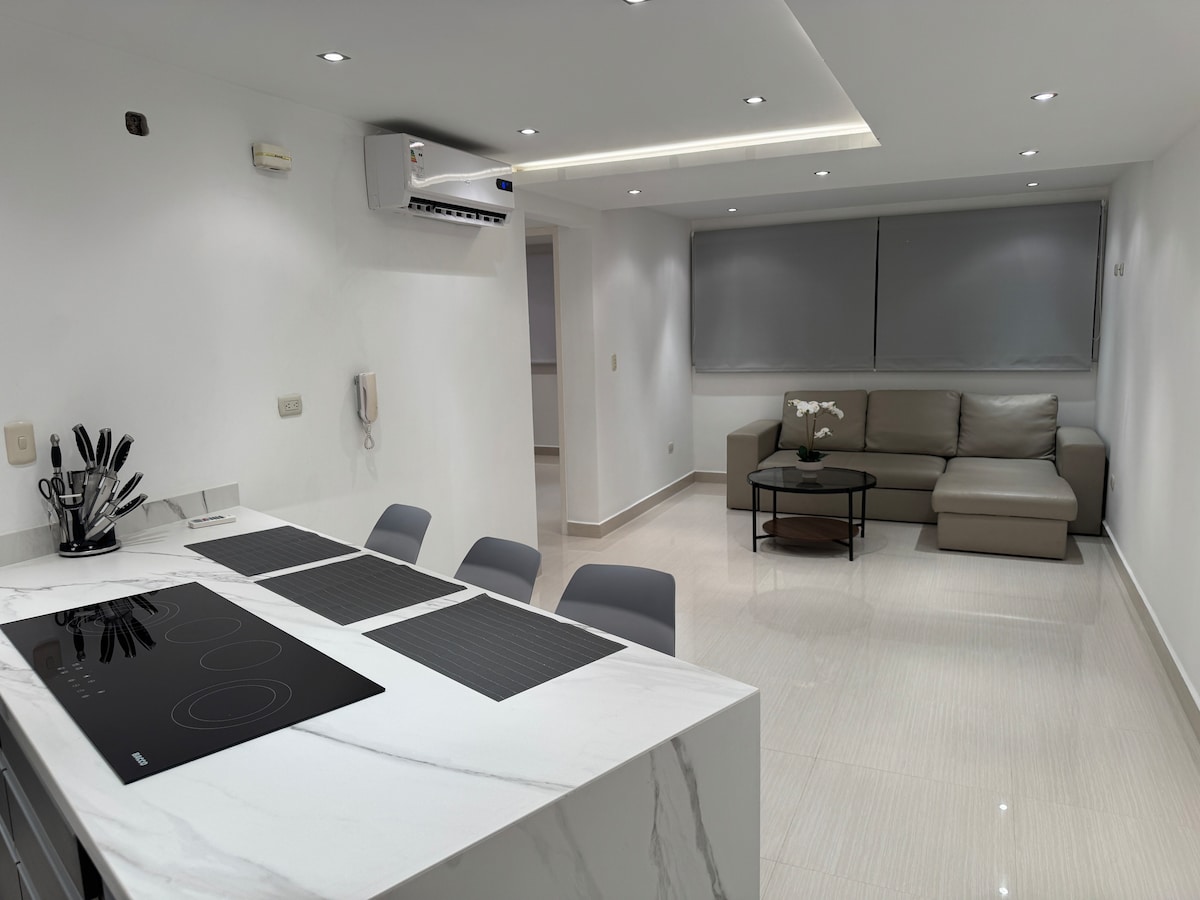 En la mejor zona de la ciudad este apartamento a estrenar garantiza las mejores vacaciones familiares o reuniones de trabajo. 2 habitaciones cuidadosamente equipadas, con aire acondicionado y Smart TV. La sala cuenta con balcón y desde tu escritorio podras ver la Sierra Nevada con WiFi de alta velocidad. La cocina brinda todo lo necesario para sentirte un chef. El edificio tiene planta eléctrica y tanque de agua. Vigilancia privada 24/7 para tu seguridad, 2 puestos de estacionamiento techado.