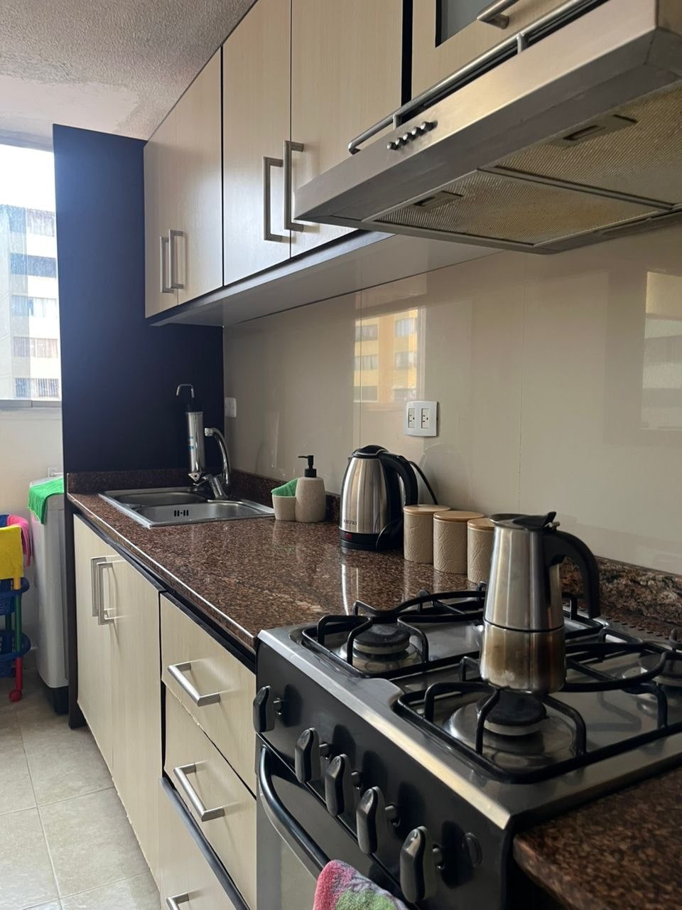 Apartamento ubicado el centro de la ciudad, cerca de supermercados, Teleférico, mercado Principal y Plaza Bolivar. Con todos los servicios básicos, lámparas de emergencia, 2 aires acondicionado, wifi, UPS y estacionamiento. El apartamento cuenta con 1 cama Queen, 2 camas individuales y un sofá cama, 2 baños, 1 balcón tipo estudio, sala comedor, televisor 50”, cocina equipada: nevera, licuadora, cafetera, microondas, utensilios, calentador, lavadora y secadora. Ofrece toallas y ropa de camas