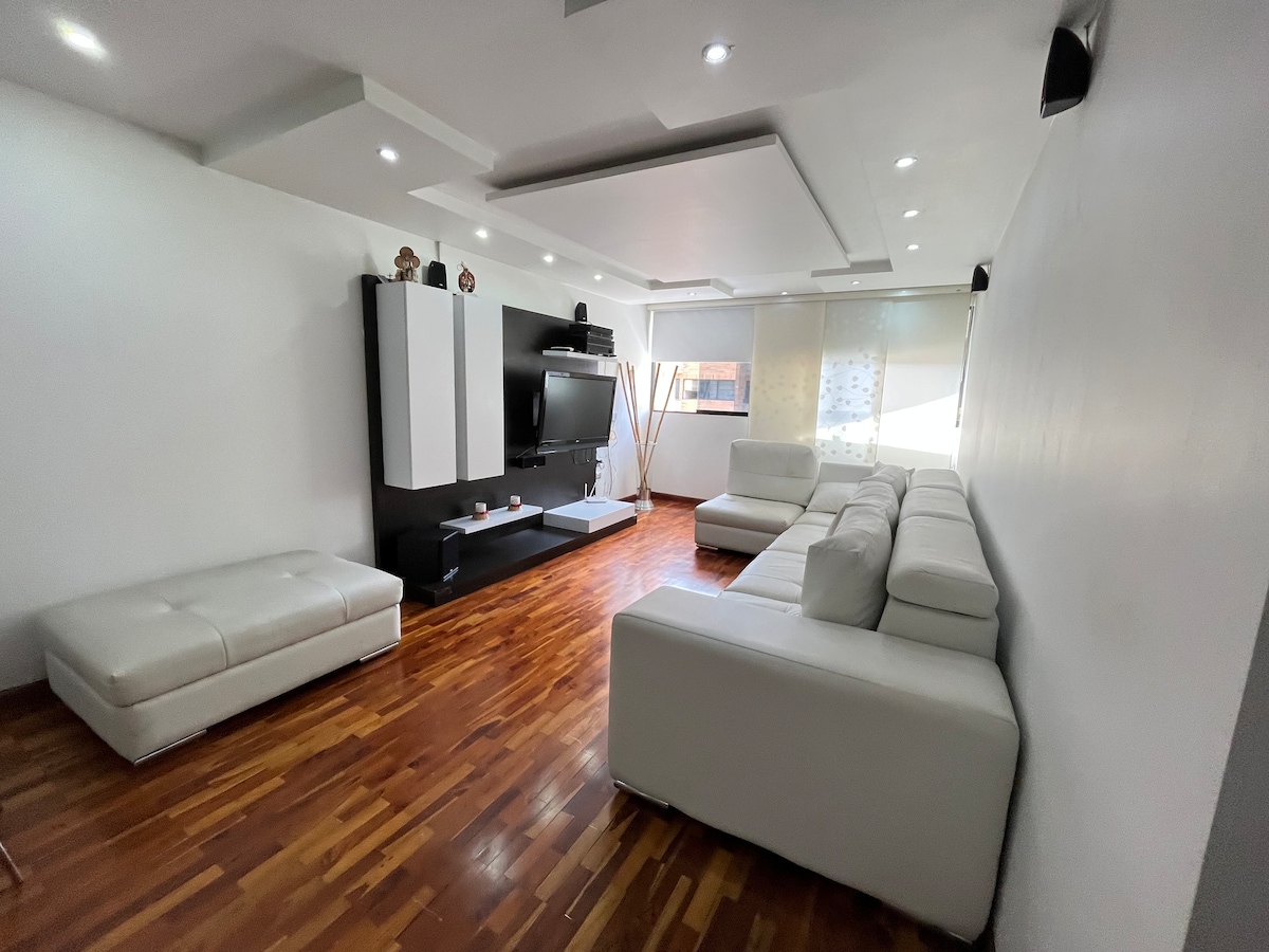 Acogedor apartamento céntrico, ideal para familias o viajes de trabajo. Cuenta con respaldo eléctrico, wifi rápido de fibra, cocina equipada y A/C en la hab. principal. En un conjunto seguro con estacionamiento privado, a pocos minutos, incluso caminando de centros comerciales, el teleférico, supermercados y restaurantes. ¡Siéntete como en casa!