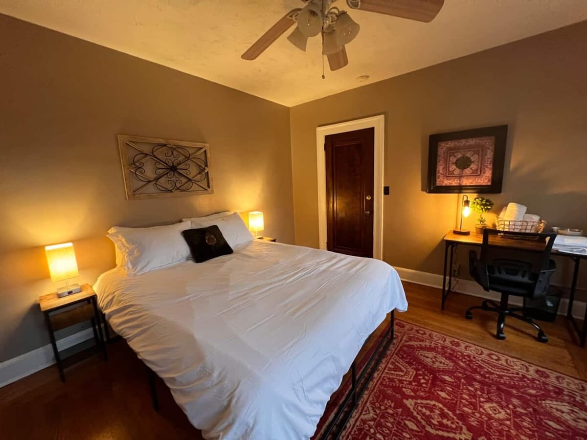 LGBTQ friendly. Our 1915 Arts & Crafts bungalow's spacious in-law suite offers driveway parking, private entrance, sunroom, king bedroom, en-suite bath, kitchenette w/fridge, micro, coffee maker, toaster. Relax in bed with 40" HDTV with Amazon Prime, HBO Max, Netflix, premium cable. Enjoy private gardens to sun, read a book or cup of coffee. Short drive to 4 Vineyards, Theater and the train station. I am not responsible for wifi.