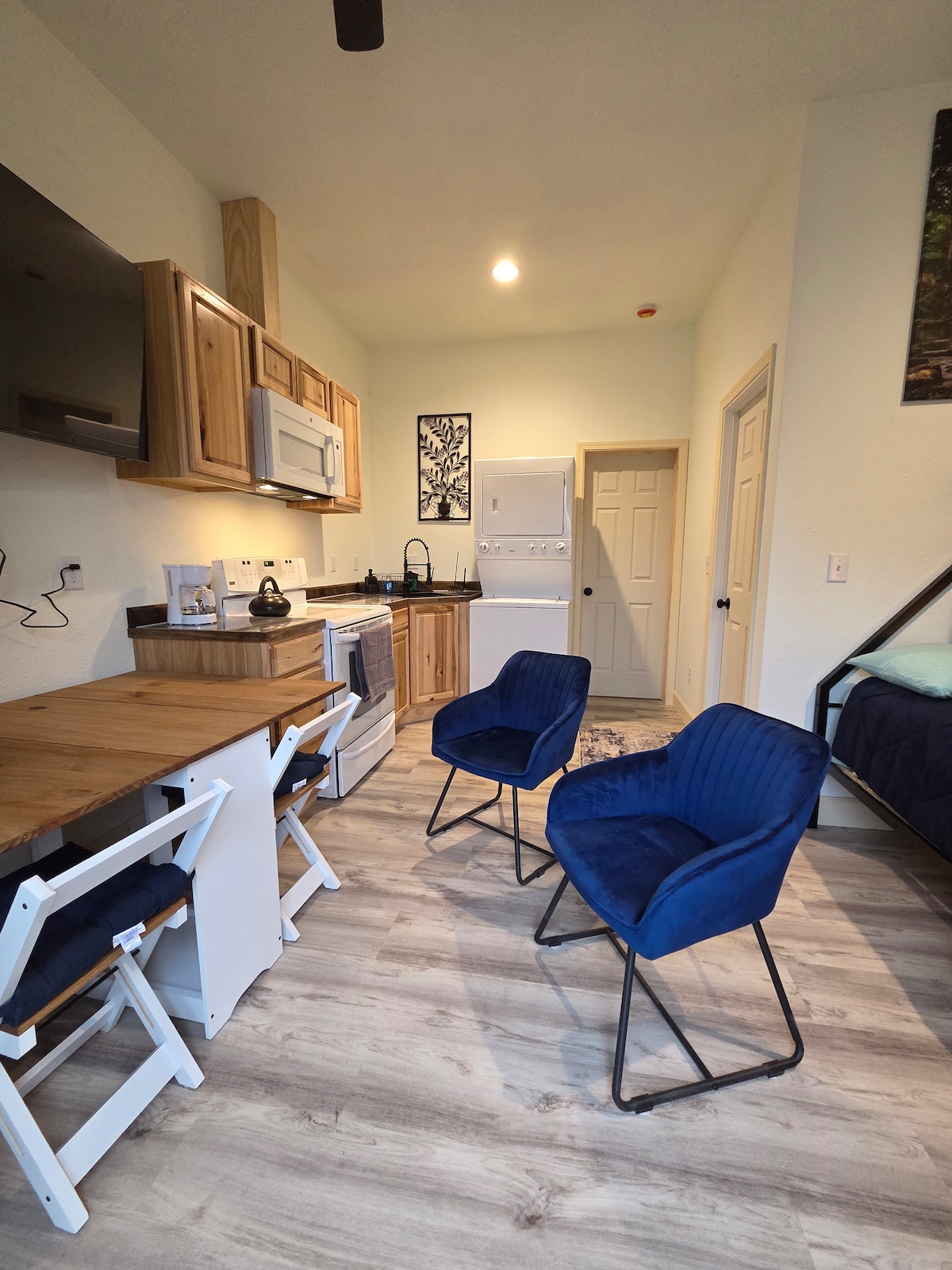* Casita attached to new home -- No stairs * Private patio * King size bed for 2 adults, bed-side lamps with charging options & outlets, full length mirror & large dresser * Couch, tri-fold memory foam mattress, pac-n-play, & air mattress available, for up to 2 more adults in the living room * 100 MBS Wi-Fi, Smart TV * Keurig with pods: DECAF, regular, tea, cocoa * Small fridge/freezer, microwave, electric tea kettle * Deluxe shower wand, blow dryer * Double closet, iron & ironing board