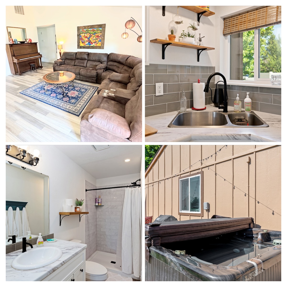 We offer a Noon checkout time, so you can sleep in and relax before traveling! Enjoy the completely private Hot Tub! You will be close to downtown Meridian, walking distance to bars and restaurants, yet in a quiet neighborhood! The full kitchen has luxurious granite countertops, new appliances, and marble backsplash. The master bedroom has a Queen size bed & TV. The living room has two twin beds & a full size pull out couch bed. A portable crib & highchair is available. RV Parking available.