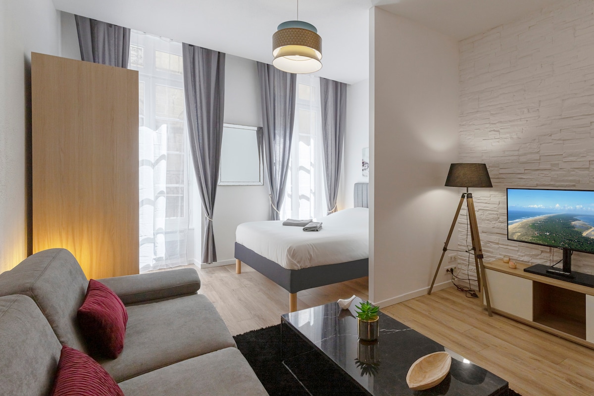 This is a bright studio located on the ground floor of a small stone building, in the heart of the Chartrons district, near the Jardin Public, the Paul Doumer tram station and many shops). The accommodation has a small fully equipped kitchen, a bathroom (sink and shower) and separate toilet. The living area of the studio is composed of a bed 2 places, a sofa bed 2 places and a flat screen. The linen is provided.