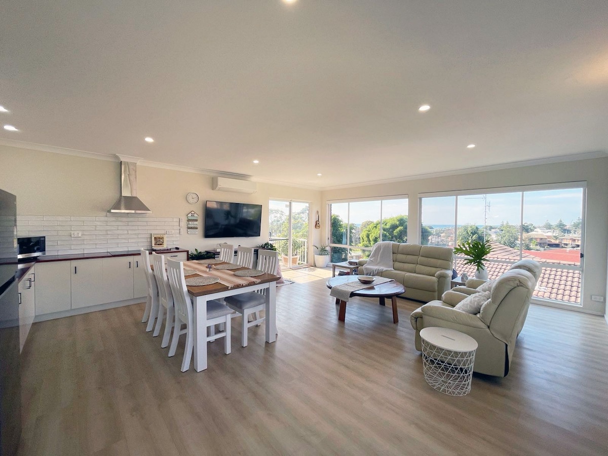 Best located property in Pambula Beach. Just completed full house renovation. Access pristine beach from the front garden without crossing any roads. Three bedrooms (one queen, two singles, 4 bunks). Brand new fully functional kitchen with dishwasher. New bathroom as well as en suite. Large lounge and dining room (flat screen TV and DVD player) with amazing beach and water views opening onto large deck with gas BBQ. Separate laundry with washing machine and dryer. Free Wifi. Books and games.