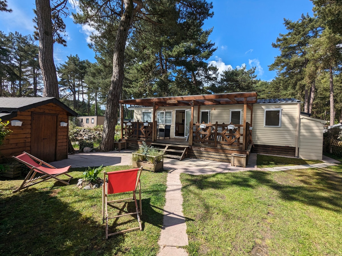 Chalet cosy, avec terrasse suspendue derrière avec vue sur mer, situé dans un quartier très calme. Cuisine ouverte sur salon, salle à manger, deux chambres, salle de bain avec douche et baignoire. Buanderie avec machine à laver, sèche linge. Terrain attenant, avec terrasse devant et barbecue. Nous mettons à disposition, et cela sans supplément, le linge de lit et de toilette. Nous ne prenons pas non plus de supplément pour le ménage, il suffit de rendre le chalet comme à son arrivée.